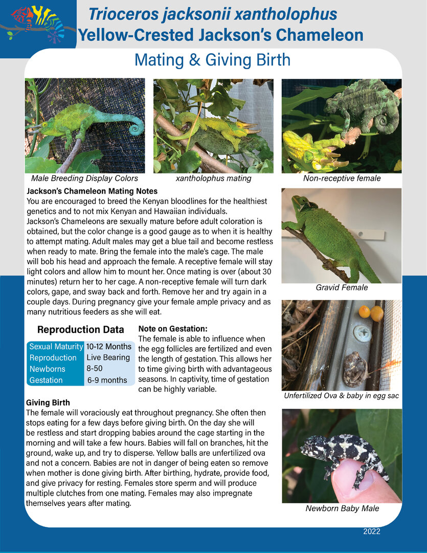 This care guide is specifically for the Yellow-Crested Jackson's Chameleon (Trioceros jacksonii xantholophus). I elected to separate out the subspecies because there may be some subtle differences.