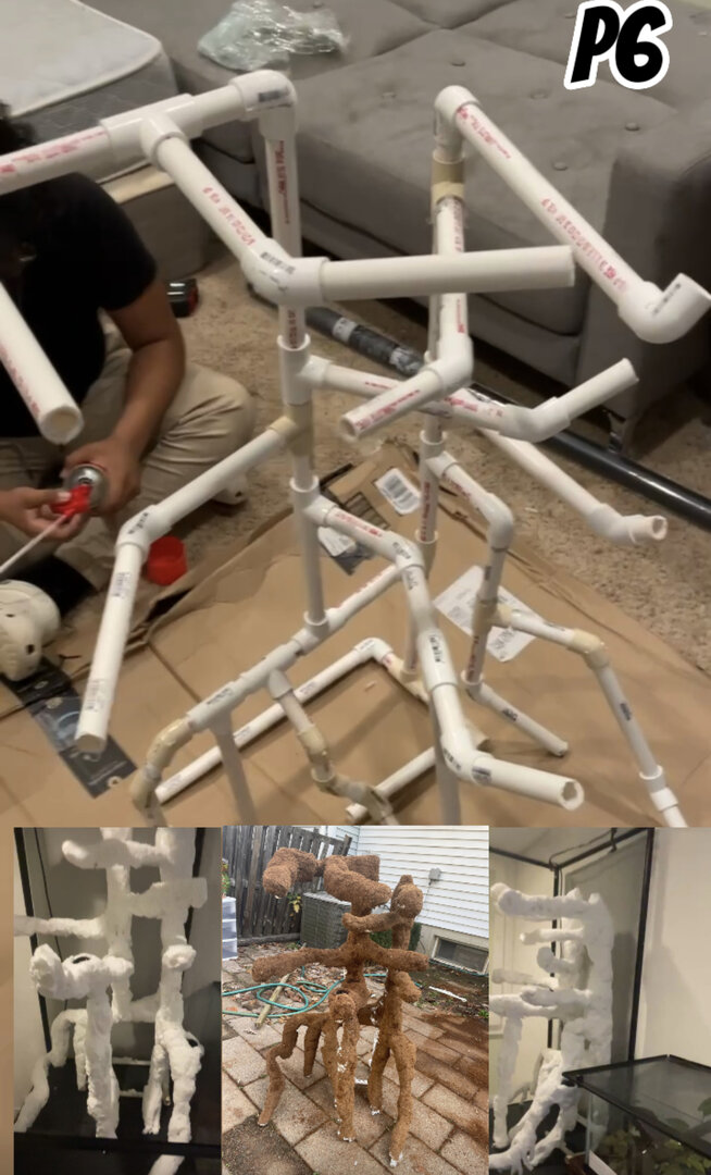 As a chameleon enthusiast, I was always on the lookout for ways to improve my pet's enclosure and provide a more natural and stimulating environment for them to live in. That's why I was thrilled when after searching the internet for hours I found someone named "The Reef Dudes" on YouTube and saw their amazing PVC pipe tree creation which they had built for their dart frogs. Watching their step-by-step tutorial, I was so inspired to try making my own tree using PVC pipe and expandable foam. The process of creating the tree was both challenging and rewarding. I started by shaping the PVC pipe into the desired shape of the tree (P1), using a heat gun to bend and curve the pipe to create a lifelike trunk and branches. I then applied the expandable foam, using a spray nozzle to evenly distribute it over the surface of the PVC pipe. As the foam expanded and hardened, I used a knife to carefully shave it down and shape it into a more realistic tree form.