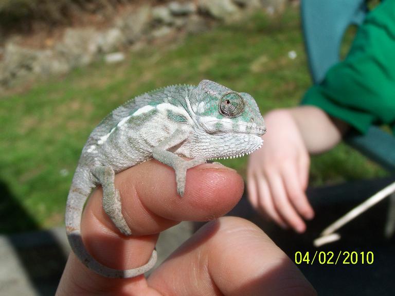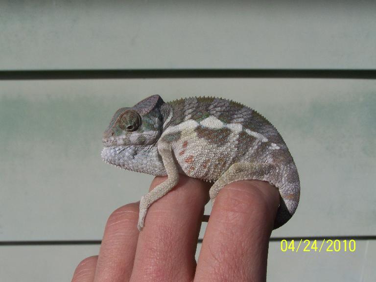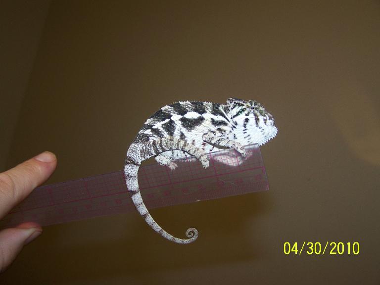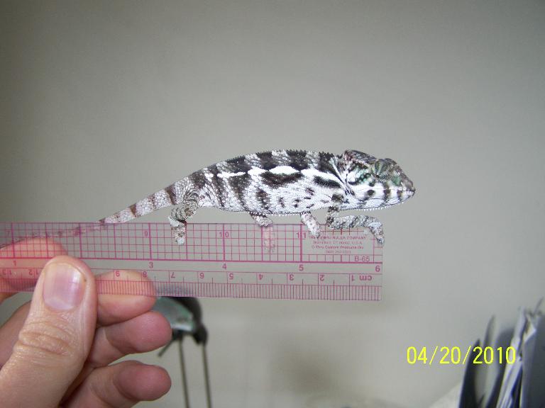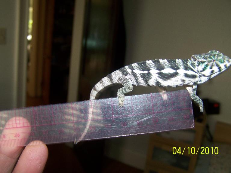 Here he is in April, so if he was hatched on Nov. 21, then he is going on 5 months old here. He seems a bit small for his age here, at least compared to some of the other pics I've seen on the forum. But then again, I don't know his exact birthday and who knows how accurate everyone else is about their chams' ages. He's been eating well, but I weighed him on the 4-10-10 and he only weighed in at 8.2 grams.