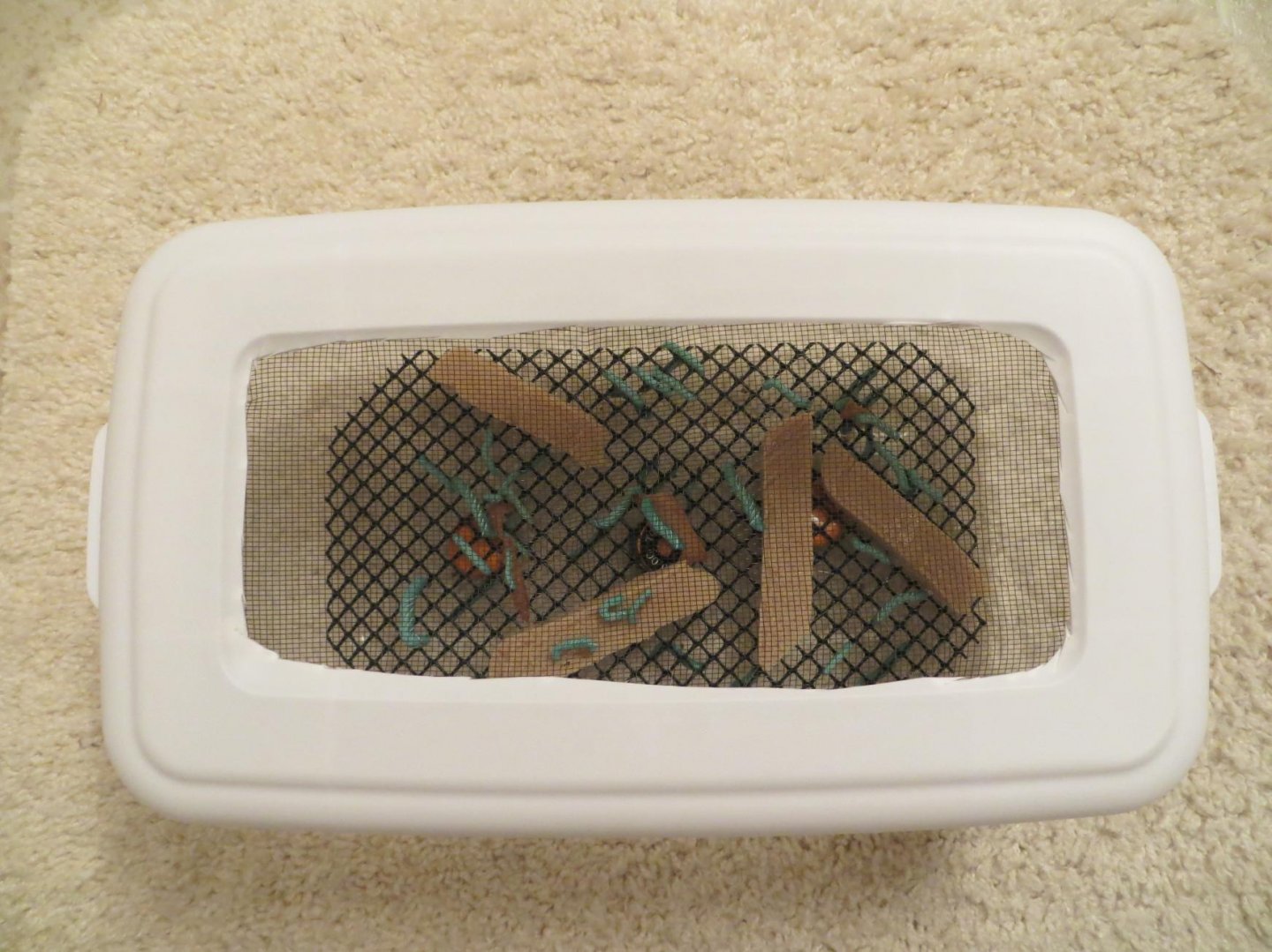 When the hornworms grow big enough to move, I then transfer them from the deli cup to a modified tupperware container. I use the sterilite 6Qt (5.7 L) Tupperware containers that state they are for shoe storage. Any Tupperware that is around that size should do. I then cut out the lid and hot glue some screen to it as shown below. I also cut some gutter guard (http://www.lowes.com/pd_11632-205-85198_0__?productId=3009380&Ntt=gutter+guard&pl=1¤tURL=?Ntt=gutter+guard&facetInfo=) to place in the bottom. I also put bottle caps in the bottom to raise the gutter guard up. This layer of gutter guard allows the poo to fall through and makes daily cleaning easier.