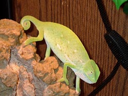All lighting and heat bulbs should be outside and on top of the cage. There should be 12 hours of UVB light, along with 12 hours of darkness for proper rest. A UVB bulb is necessary to synthesize vitamin D3 in the skin and to facilitate absorption of dietary calcium. UVB bulbs only emit UVB rays for 6-8 months, even if they’re still shining, so they must be replaced at least twice a year. A basking bulb creates the heat gradient so that your cold-blooded chameleon can regulate its body temperature by moving into warmer or cooler zones as needed. When choosing a basking bulb start with a 60watt bulb and monitor temperature closely. Higher wattage bulbs are hotter in temperature and vice versa so choose the appropriate wattage bulb based on the temperatures achieved. A bulb that makes it too hot can burn your chameleon badly even from several inches away and through the screen. See Chameleon Lighting for more information.
