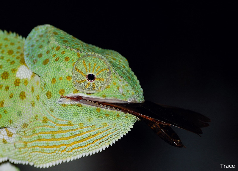 Like most chameleon species these three chameleons are tree-dwelling reptiles that are active only during the day. They can generally be found hunting prey or basking on the branches of trees and large bushes. Chameleons are very territorial and don’t tolerate the presence of other chameleons in close proximity. When threatened they will frequently change color and inflate their body to appear larger. Contrary to popular belief, chameleons don’t change color in a direct attempt to match their background. Their color changes are influenced most by their state of health, emotions or level of stress, and the process of thermoregulation. While these species are relatively calm in comparison to others they are better for observation and should not be handled regularly.