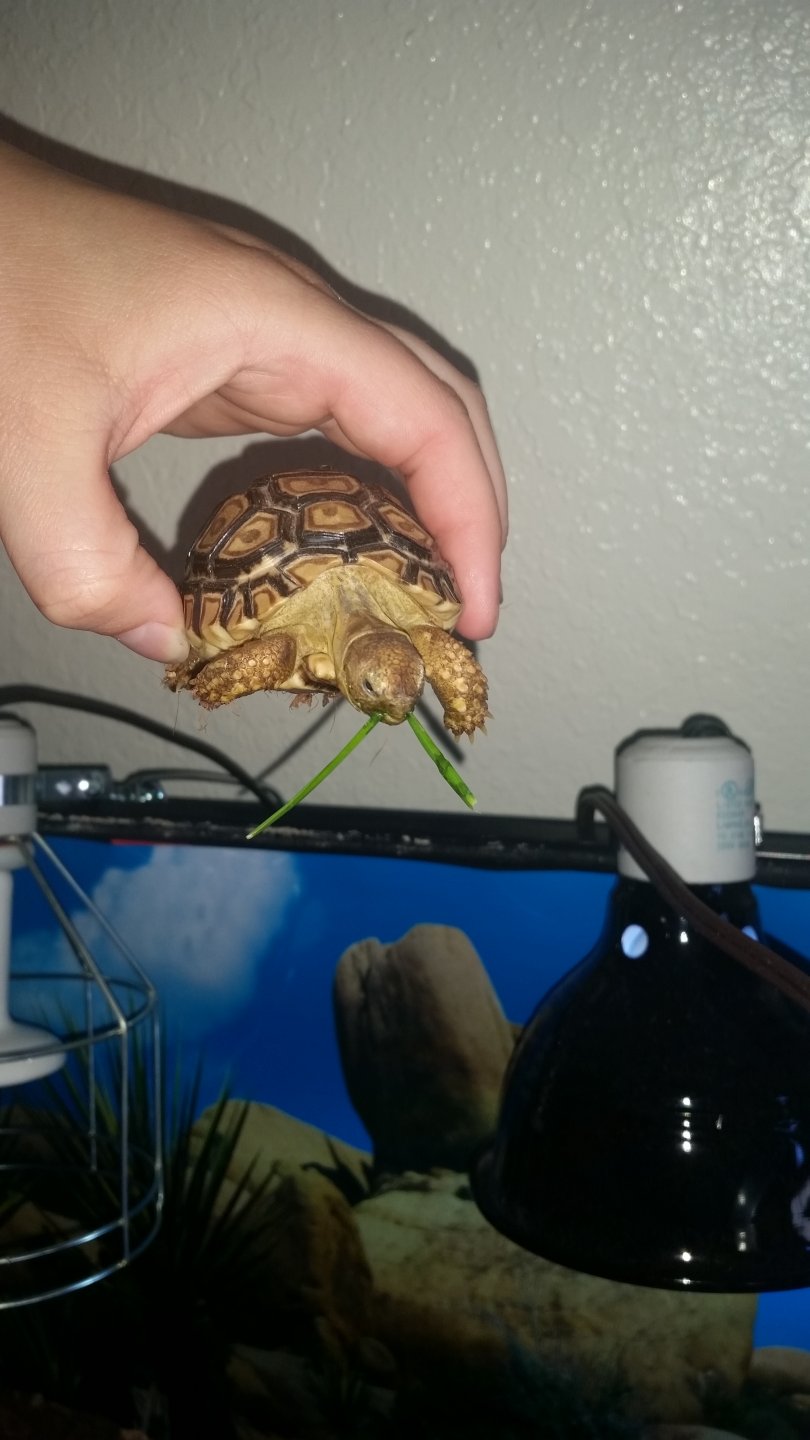 I took Bert outside and he found a blade of grass. He didnt want to eat it but he sure wouldn't give it up. He had quite the lock on it. As you can see he ended up getting to bring it home with him.