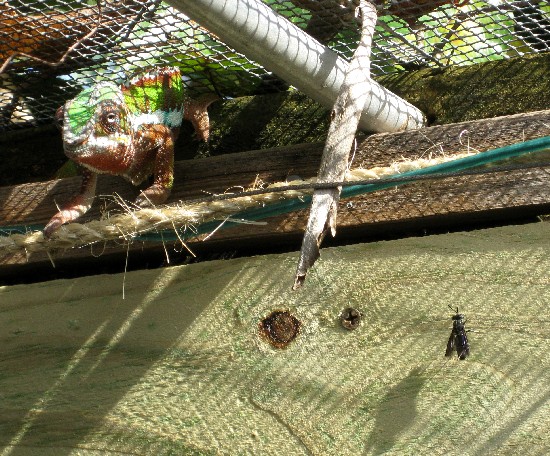 Black Soldier Fly, adult fly in walk in cage with hungry chameleon ready to strike.