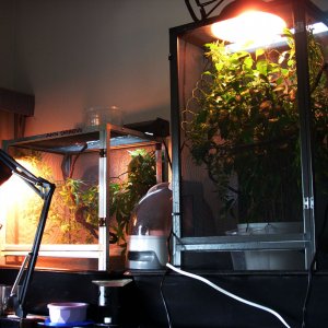 This is my set up for my Female Veiled and my two flapjacks. The concrete container collects water that also has two bricks in each to raise the cage so the doors can open.