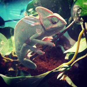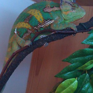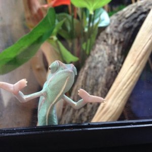 My Yemen chameleon Del boy when he was a baby and now one year later. He loves to come out his viv for a cuddle. I love him