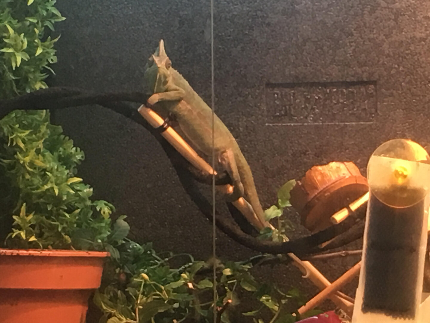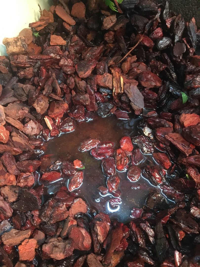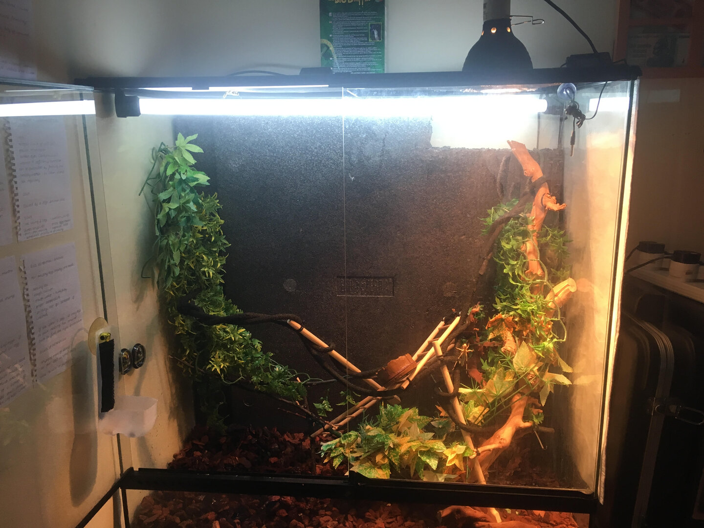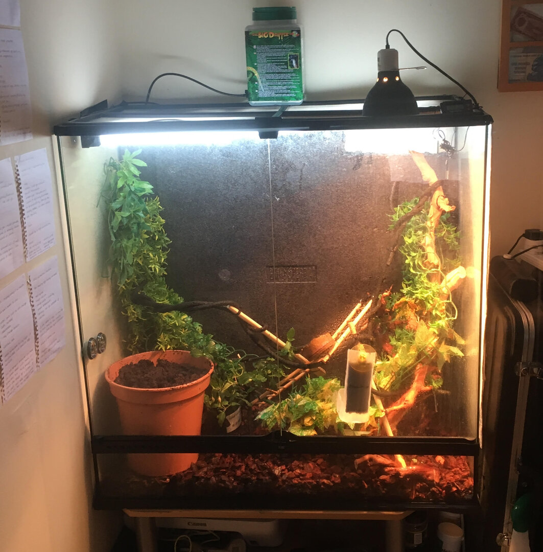 She is petrified of me, hides, even hangs upside down to be away from me, i have at least gotten her to drink, she has a big dripper and when i mist she will drink after a while. I have a live fuchsia plant, reptile bark and a humidity gage (currently 64% at 17:43pm ), I have a cool side of around 25/26c and a warm side of 33 to 37c. a good reptile UV bulb and a basking bulb, she's got a nice flat belly so does not look gravid, but today out of paranoia I have placed a bucket in her enclosure with organic soil in it, moist enough to dig but will retain its structure. also the floor of the enclosure gets saturated with misting water and dripper water, I had to bail it out today. is there a way to deal with water that doesn't mean drilling a hole in my glass enclosure?