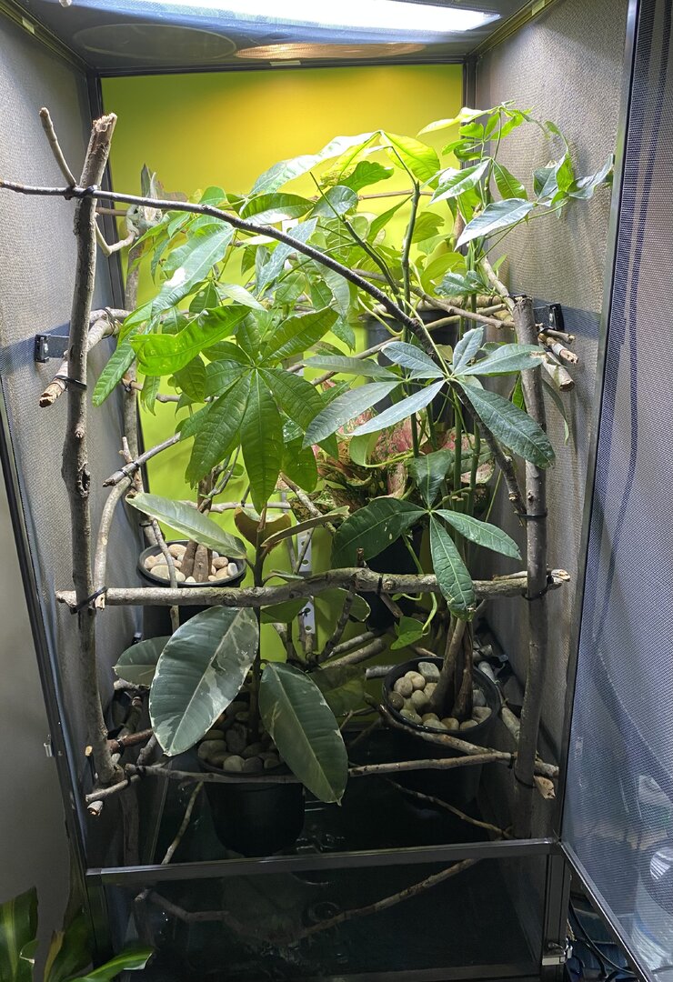 - Lighting and Heat - Arcadia ProT5 6% 24W Forest UV-B Kit, Jungle Dawn 34W LED Bar, 100W black ceramic heat lamp in a Zoo Med deep dome, 65w BR30 flood light and another black ceramic heat lamp in a Zoo Med dual mini dome that stays off as backup. The ProT5, LED bar and the ceramic heat lamp turn off 30 minutes before the flood light to signal that the sun is going down.