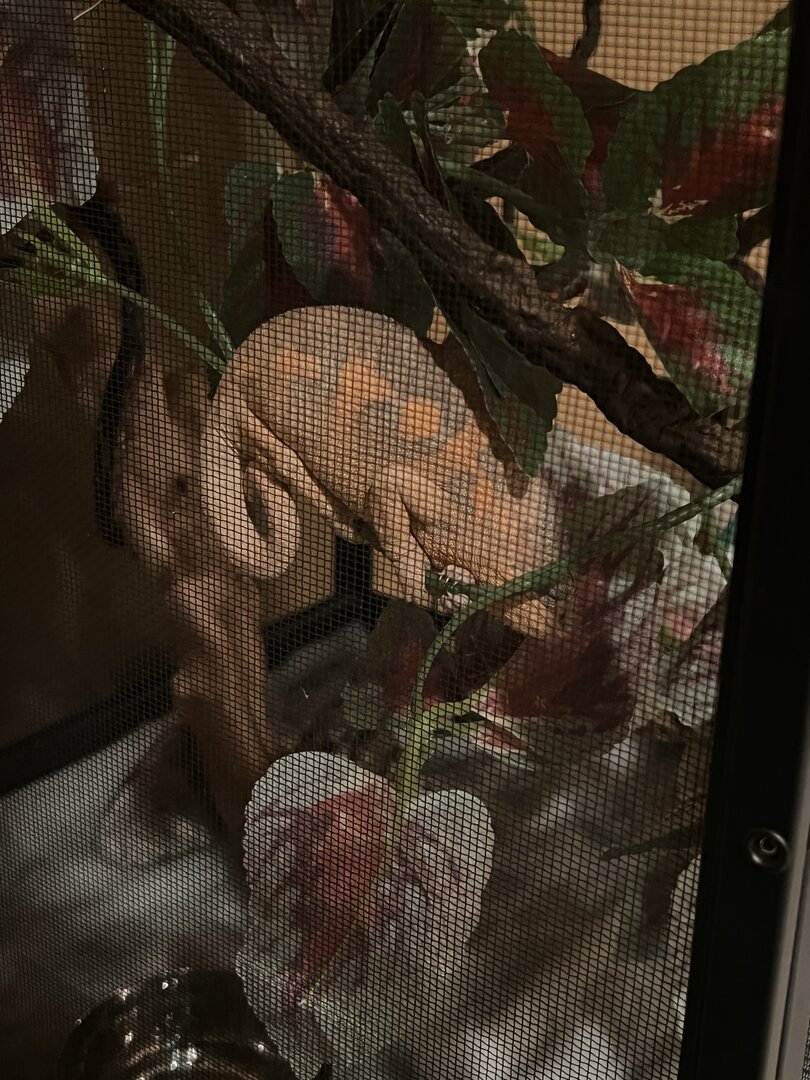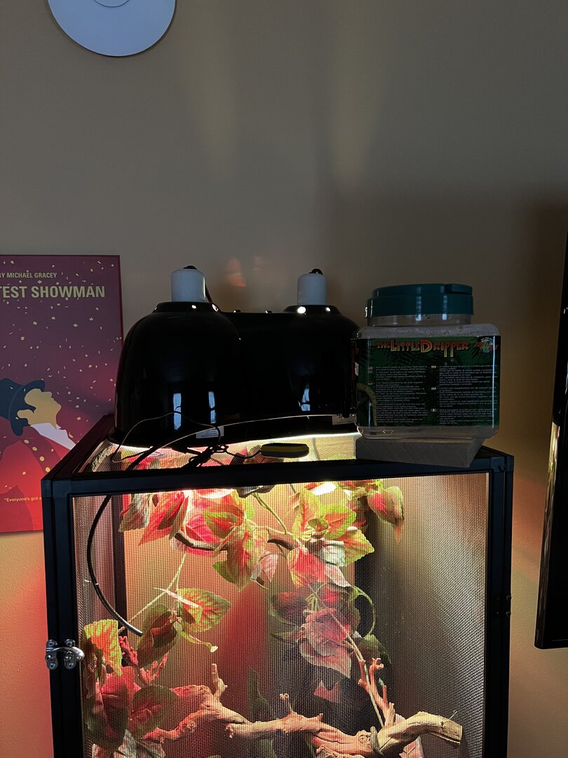 Since she has been with me, I haven’t seen her eat but I have seen her drink a few times. I keep bugs in her enclosure all day just in case she decides to eat. She mostly just hangs out in one spot. However, it’s a different spot each day. She has a little dripper that goes constantly and I spray her enclosure multiple times a day. I also haven’t seen her poop just yet either.