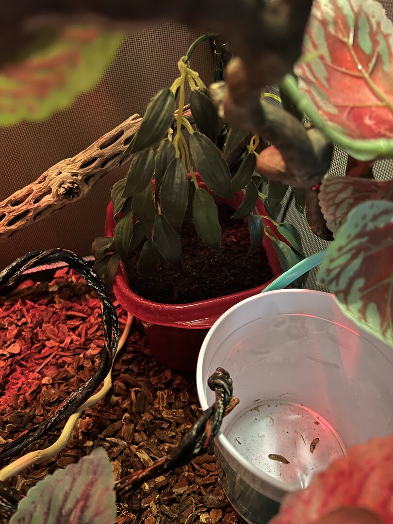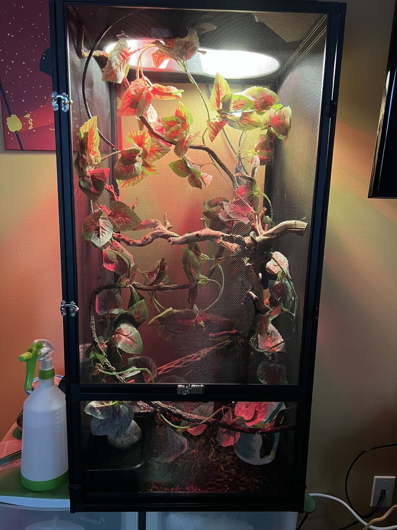 She’s got lots of leaves and vines to climb, a lay box just in case she needs it, and a dish for her wormies and such.