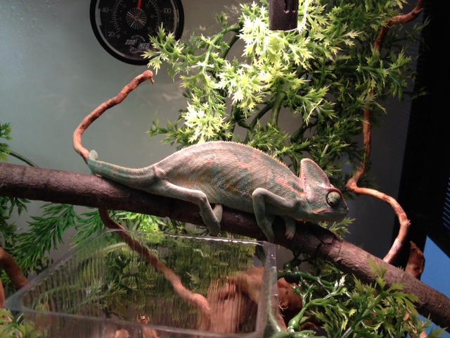 Your Chameleon – Male Veiled Chameleon, around 3-4 months, has been with me for 1 month since I bought him from a pet store. He is around 12cm for body without counting tail and 3-4cm wide. There is another female veiled chameleon with only 1/2 of his size but with similar age. (I bought him and her at the same time in the shop)