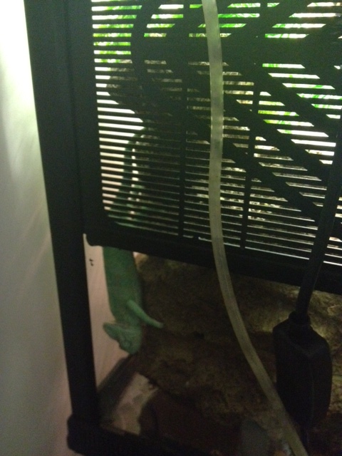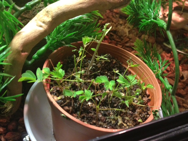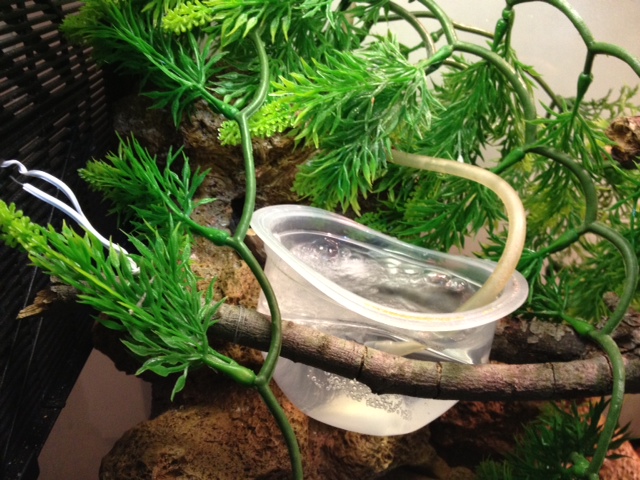Watering – water pump with running water; only see him drink once so far. He eats soil of real plants several times a day I notice, I guess it would be used to help him digest