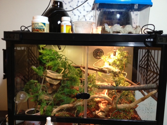 Current Problem – He stop eating suddenly and today already the 3rd day. He has no interest on eating and he seems don’t like me to approach him. He is trying to escape and hide behind those fake leaves. He walks shaky and most of the time he is just very wide and lying on the branch, for a long time. I also see him go down to the bottom of the cage for 1-2 times in these few days. While he is at the basking area (not the hottest spot), he has his one eye shut which I have never seen him shut his eye in the day time. His action is also slower than before he seems sensitive to everything around him.