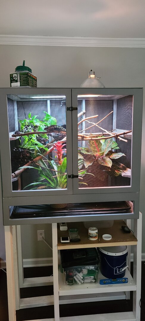 Fantastic job... I am a little jealous that you can put plants in on the floor panel... A little tip is to use the clay pots and it will help absorb the water from the drip pan...Martin moved into his new home today the same day that we did. I still need to make a couple adjustments, fix the stand a bit, and put a couple more plants in there, but here he is in his "finished" enclosure: