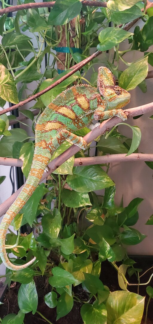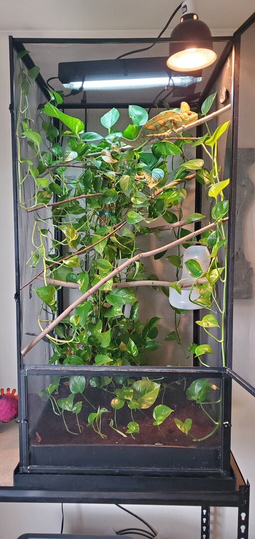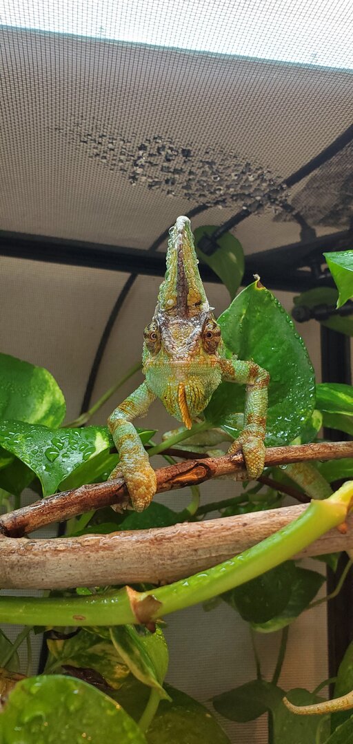 Hello! Hopefully I am doing this right feel free to let me know if there is anything else information wise that you need to help me, I attached a picture of the cage and feeding methods I use. So Chamo is about 4 years old now and id say for the past 4 months it has been such a struggle to get him to eat, it started after I fed him only horn worms for a good 2 weeks and then the only thing he wanted to eat was horn worms. I thought this was kind of normal and him being a bit of a brat haha, but it did worry me and since then hes gone on multiple hunger strikes for 3-5 days and inbetween will only eat 1 large dubia roach (roaches are right before adult stage) every other day (sometimes everyday) but again whenever I offer some horn worms he has no problem eating multiple large worms everyday. I remember he used to eat a few large roaches a day a year ago, so I don't know maybe its normal to only eat one large roach every other day now at his age? Personally seems like its not enough though, and another issue is that I haven't been putting the vitamin powder on said feeders nearly as much because it seems like then he 100% wont eat the roach. Now to actually feed him I have a cut out jug thing (see in picture) that I always keep feeders in if he wants to eat out of it, he RARELY actually eats out of that jug though and will only eat out of a green cup that I have to hold below him (im fine with this method btw just letting u know incase it helps). TDLR: is it normal for a 4 year old veiled chameleon to only eat 1 large roach every other day, what are some methods I can try to avoid hunger strikes, and what are some signs of an underweight veiled chameleon?