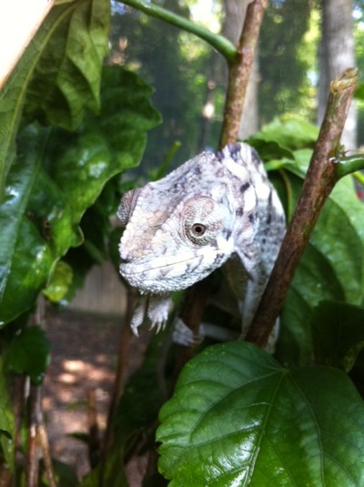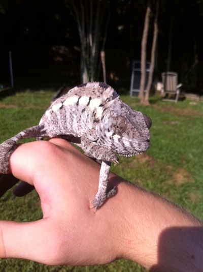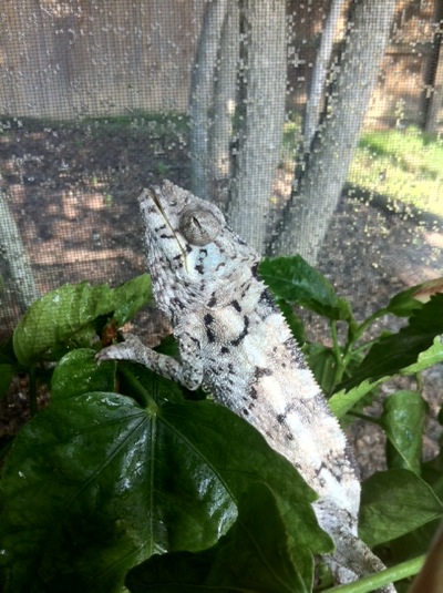 i believe she was originally a wild caught, but i think the guy that had her before me had her for a while...she cant shoot her tongue, so i have to cup feed her and monitor her eating...she has put on a little bit of weight since ive had her...as for the weather, it was about 80 or so out there today, had the 4 chams (3 panther, 1 veiled) out there for about 8 hours today...she is my favorite though, so sweet and very comical