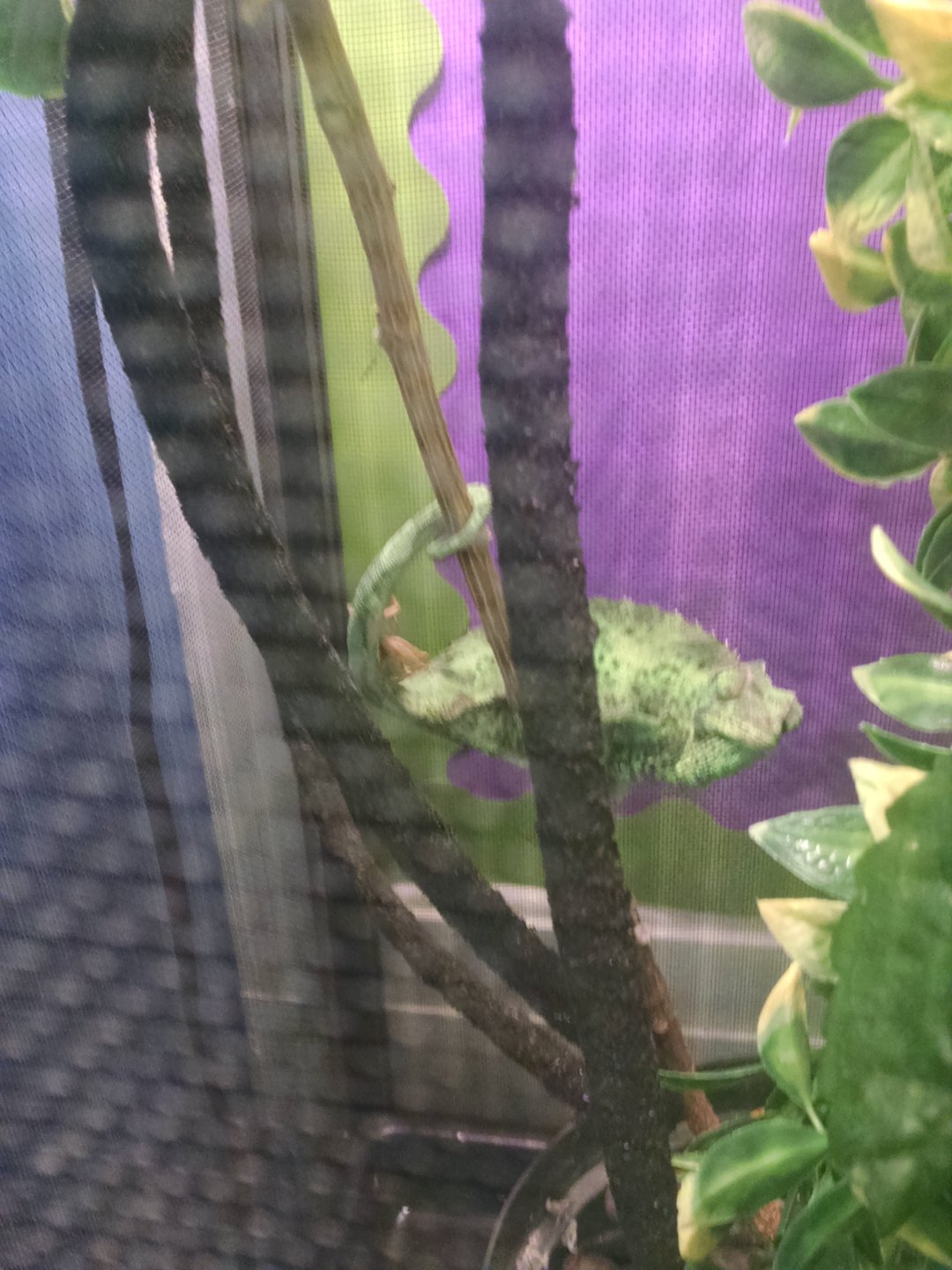 Somehow a cricket fell on top of my chameleon! And my chameleon was looking at her butt thinking "How do I eat this thing? If I move too fast it will hop away!" It was hilarious! I had to try and get a quick picture! Sorry for the bad quality.