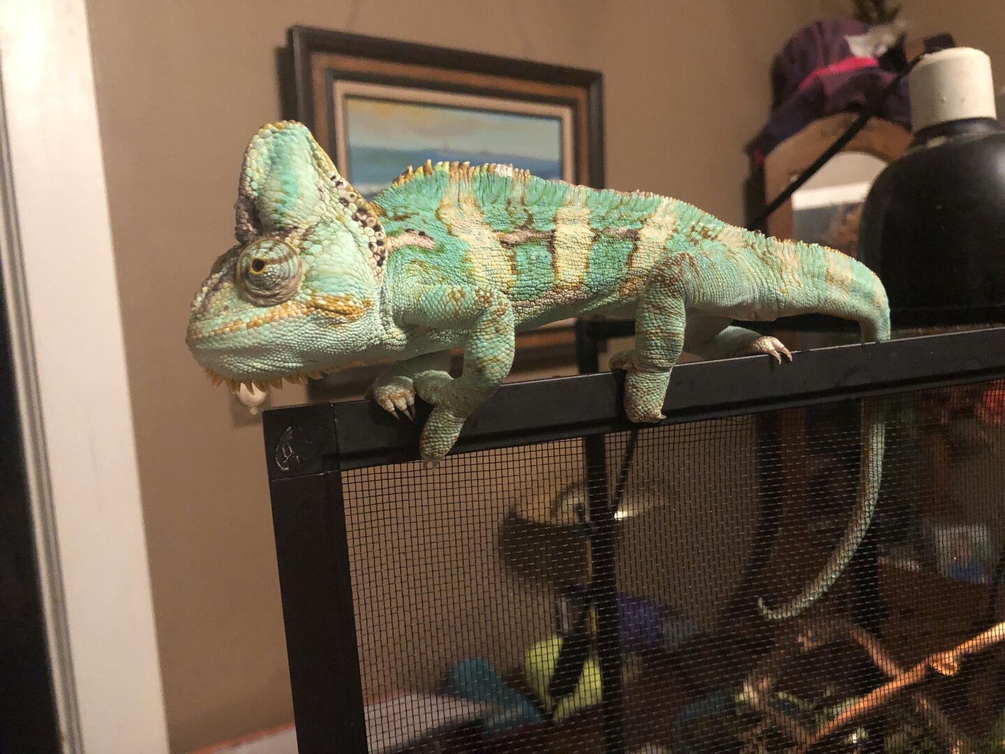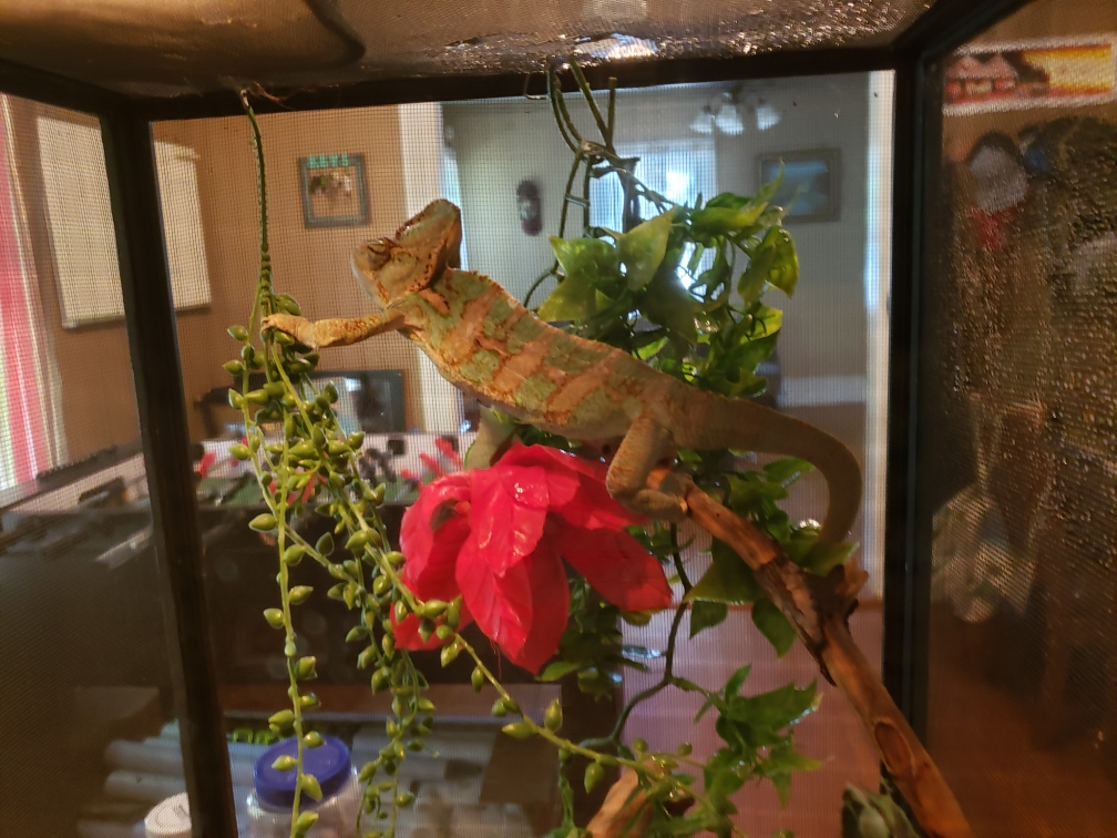 Hello there! I adopted a veiled chameleon just a few days ago and want to check in with all you marvelous people so that I make sure he has an appropriate set up, and he is healthy (or suggestions on how to get him back to healthy). He came to me in a fairly small, completely mesh enclosure but did have the basics from what I can tell. I am buying a much larger cage from a friend (I believe its 4-5 feet tall) and want to make sure I fill it up accordingly. Thank you for all your help!