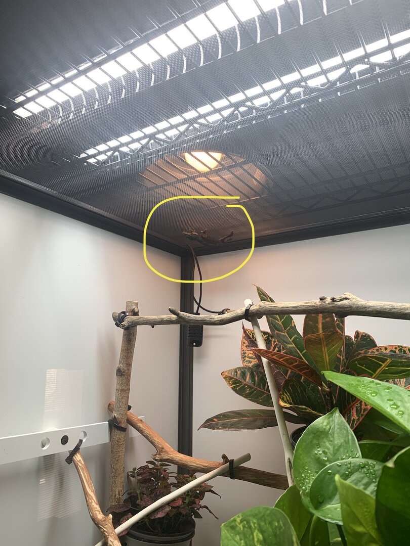 - Should we be concerned about him making his way back to the top of the enclosure? The branch we added is still there. Does the temperature probe need to be moved at some point, so that he can't use it to climb to the top? It sounds like this is just a thing that babies do though. The lights are on a wire shelf 3" above his enclosure.