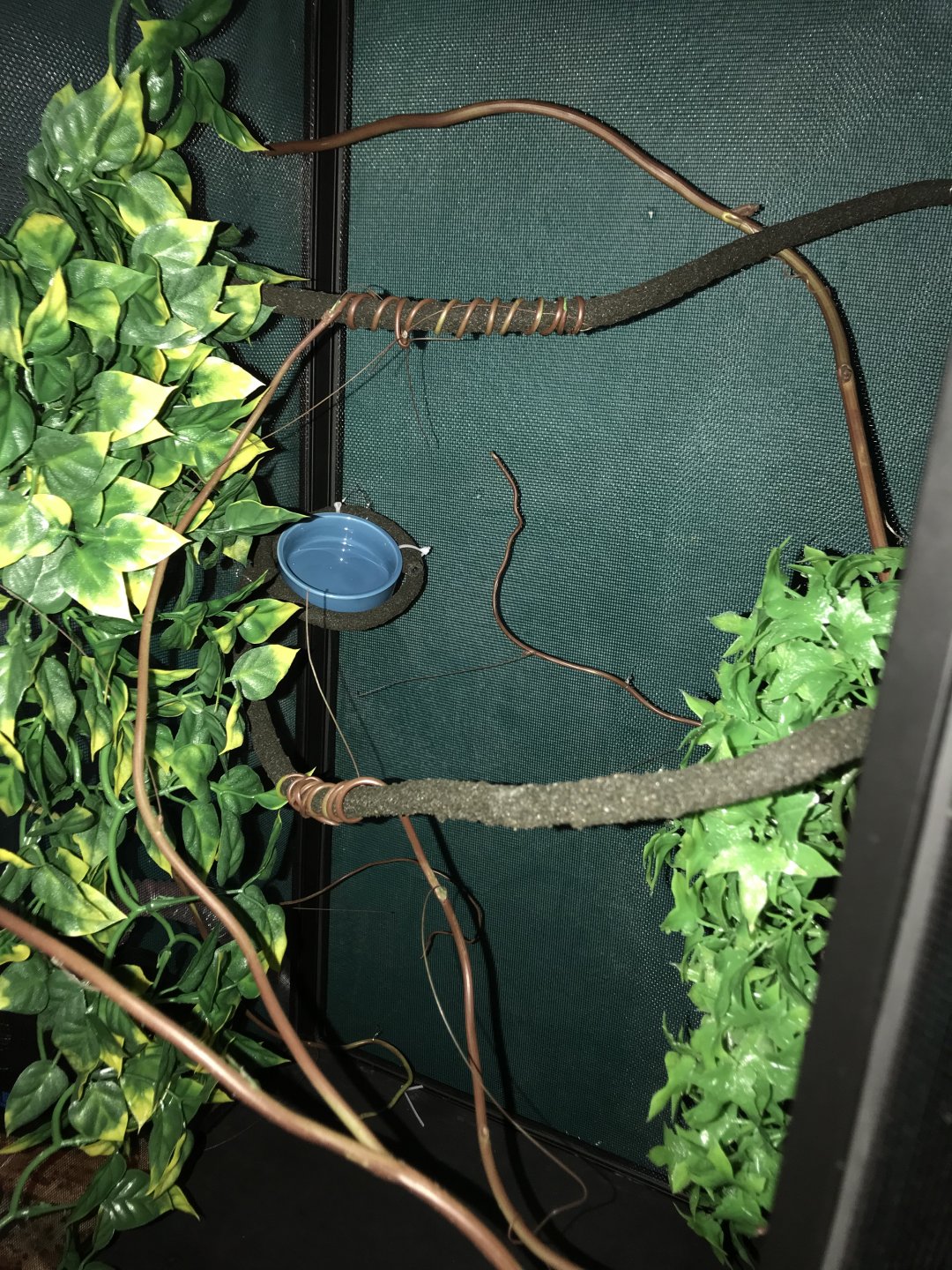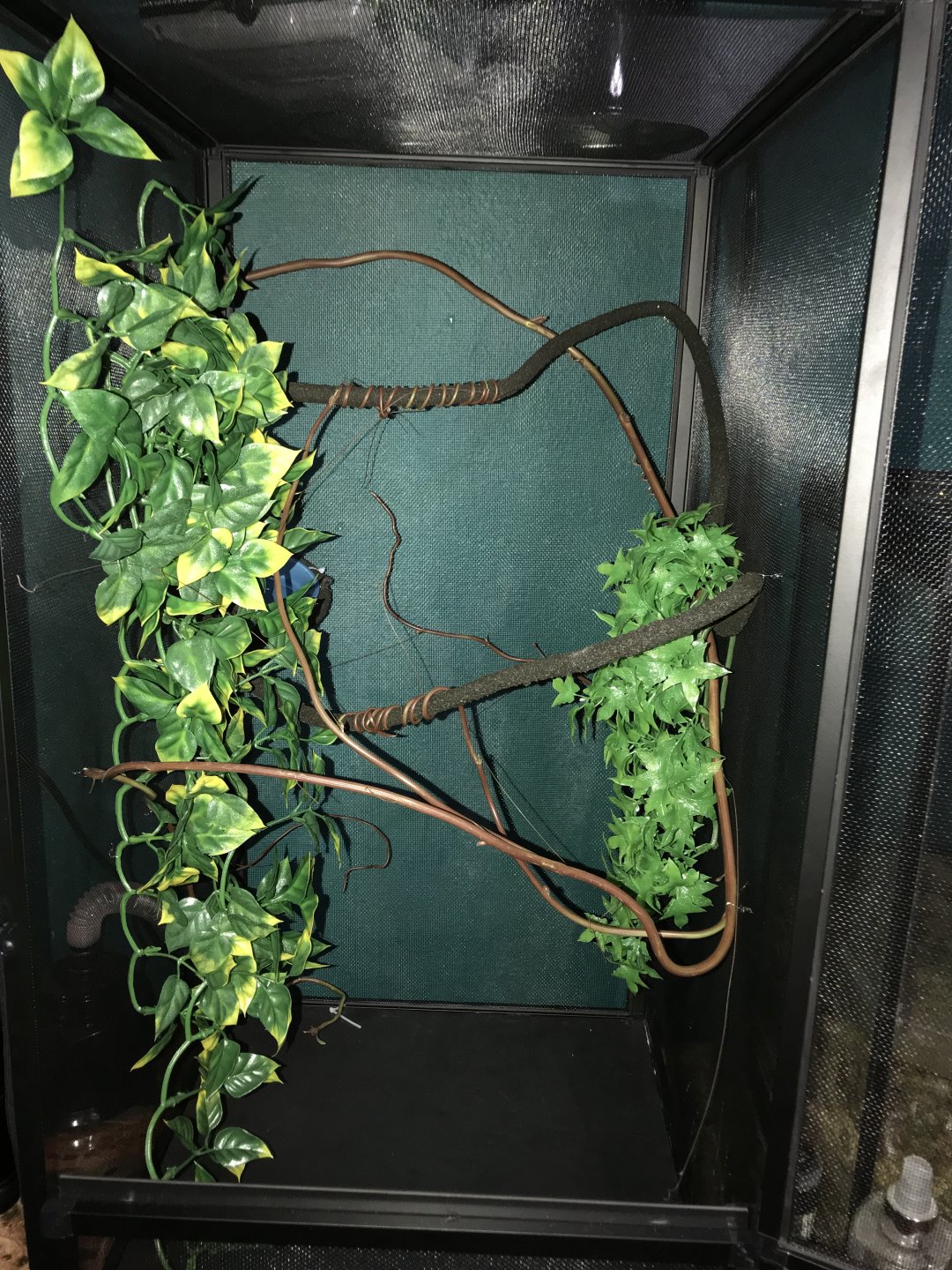 This is my current screen cage set up! I’m going to get a pathos plant tomorrow due to the shortage of ficus in my area.. any other tips to put in ? I have a double bulb system on top of the screen View attachment 199975 as well as a “little dripper” any tips on what to put at the bottom of the cage? Would some false moss or reptile carpet be ok!?