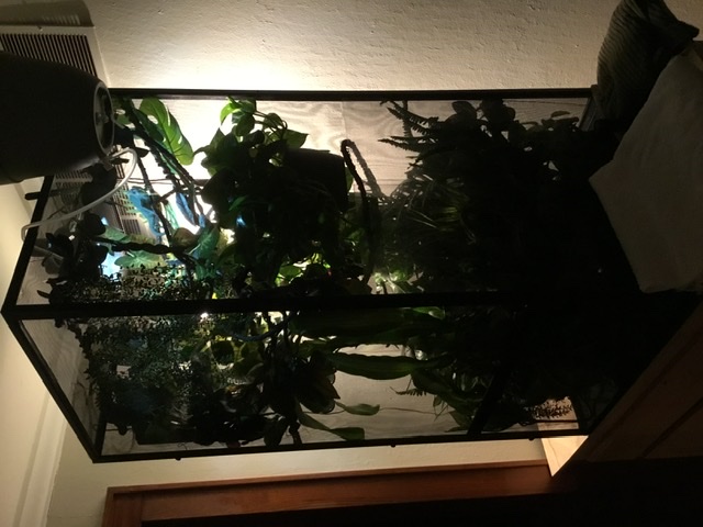 • Temperature - Daytime is 100° at the very top/basking spot with 45% humidity. Bottom is 73° 53% humidity. Unfortunately I don’t have overnight temps or humidity. We keep our house at 72° year round. We have a dual temp and humidity gauge at the top and 1 temp gauge and 1 humidity in the middle. Neither are digital.