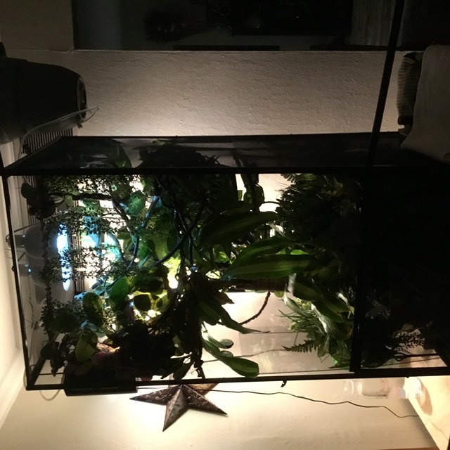 • Watering - We have a ReptiRain set to mist once an hour for 15 seconds. I also hand mist 2-3 times a day for about a minute each time. I have a DIY dripper that works perfectly. I also treat all of the water with ReptiSafe. I don’t see her drink so lately I’ve been giving her water by hand. I have to force the first drop or 2 into her mouth (VERY gently) then she drinks without issue until she’s done.