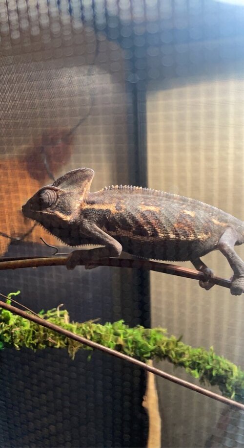 He is a little guy, the store had him for 4 months, so I imagine he's about 6 months give or take. But he has turned this dark camouflaged color once last night and then again when I went home during lunch today to spray the cage and feed him. Every website says the color means something different... One says it means he's absorbing light, another says he's excited and wants to hunt (hungry), and another says he is super stressed out.