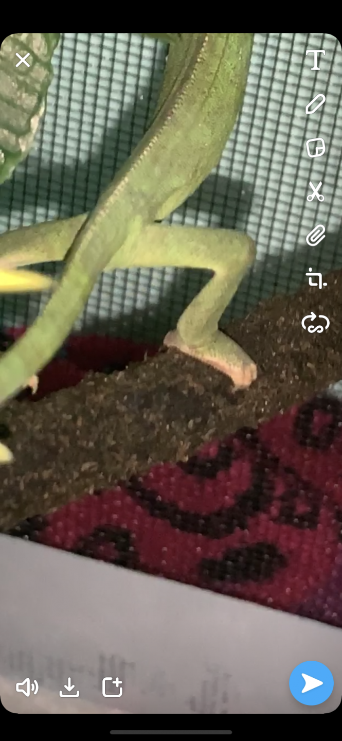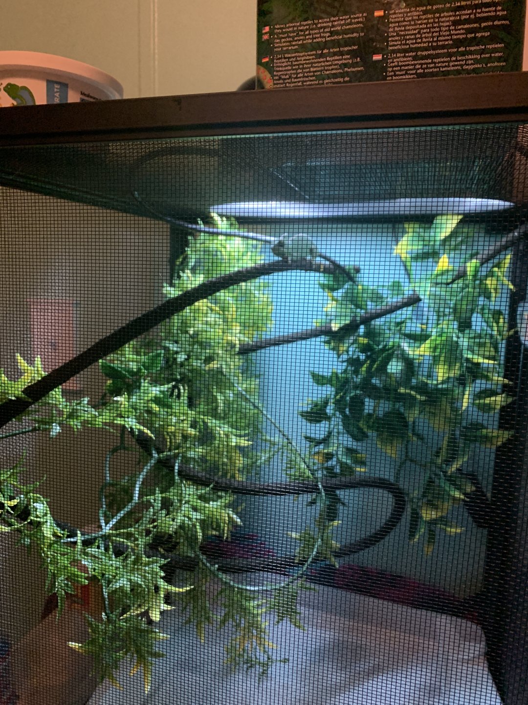 • Watering - What kind of watering technique do you use? How often and how long to you mist? Do you see your chameleon drinking? I use a dripper from zoomed and mist more than 3 times a day for about a minute each time. I haven’t caught her drinking yet because when i watch her she gets nervous and wants to stop what she’s doing.
