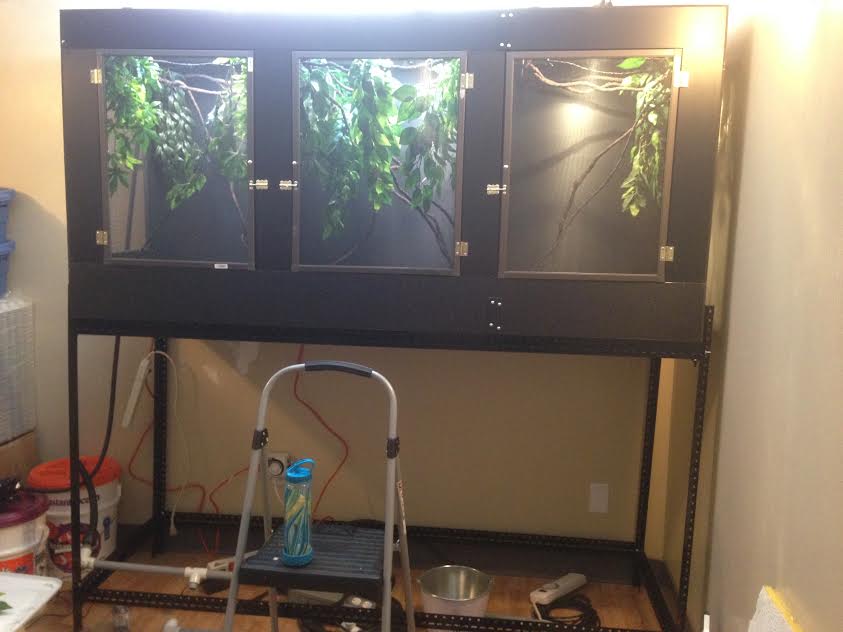 Here is one picture, sorry, the only one I had on my phone. On the left you can see the two 5 gallon buckets. The front one has the pump screwed onto the lid, with a hole in the middle of the lid for the hose to go through, and the drainage bucket behind it, with a hole in the lid for the hose to go in. The piping is laying on the floor. And oh ya, do you like the enclosures we built? lol. I'll start a thread with my cage build, in there you will also see the misting system. More pictures to come