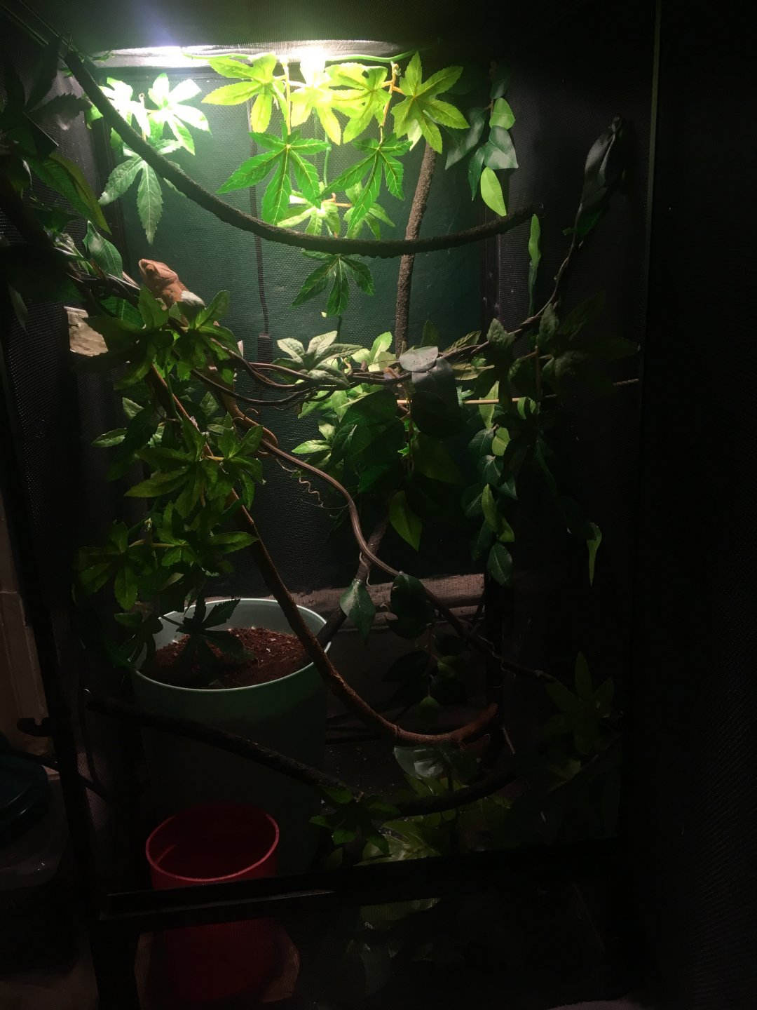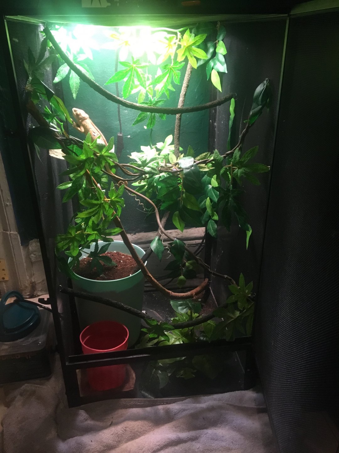 When we first got her they were feeding her only 2 crickets a day and 3 meal worms I’ve done a lot of research due to me never owning a chameleon found out meal worms are a treat so I started her on super worms and crickets cause she was soo skinny so I would put 10 baby crickets in her cage and leave 2 super worms roaming around to see if she would go for them and she did all of them I looked up over feeding and it said to give her 15 medium I felt that was a bit much so I kept her going with 10 crickets 2 medium and 8 small and occasionally as a snack some superworms no more then 4 a day she’s getting older and she’s about to turn 8 months on the 19th. I still want to make sure if I’m feeding her correctly I still do 10 crickets a day 5 small 5 medium but recently I’ve notice she’ll eat 2 or 3 and leave the rest in there. So I did a test where I gave her 5 one day and 5 another day and she’ll still just eat 2-3 so do I continue to feed her daily or every other day? Also what are some good big plants to put in her cage I want to I corporate live plants into her habitat I had the normal 16*16*36 cage but I’m going to upgrade it in February to a way bigger one. Also she likes being handeled only when she’s not shedding when she’s shedding she doesn’t mind it too much but ik that she gets upset so I don’t really bother her too much. Also I’ve realized when she sheds there’s pieces that get stuck in her nose and ik for bearded dragons ur supposed to help them take it out but her nose hold are so small I darn wanna take chances in hurting her and does anyone have tips for the drip system she uses it only when I let the water go down at full speed she doesn’t like the drips and I don’t know y I up the tube above a leaf so she doesn’t see it