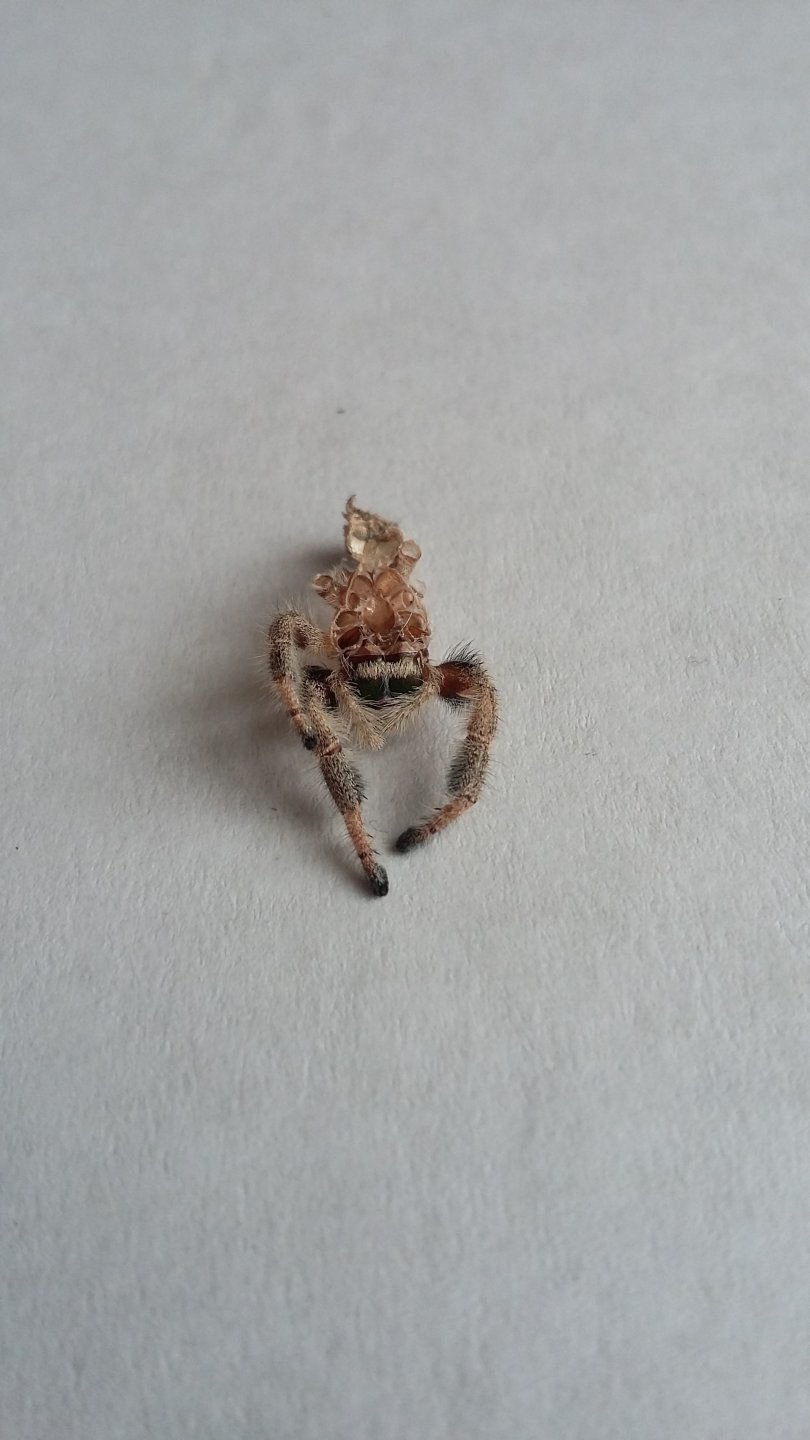 So, at lunch time I misted my Regal jumping spiders and noticed that the female had molted. Then, just a few hours later the male molted too! Today has been so exciting and amazing! Here's a pretty poor photo of Bella with her skin alongside her. Now I can't wait for the to turf the skins out from their we hammocks so I can have a good look and take photos! Love my spiddies!