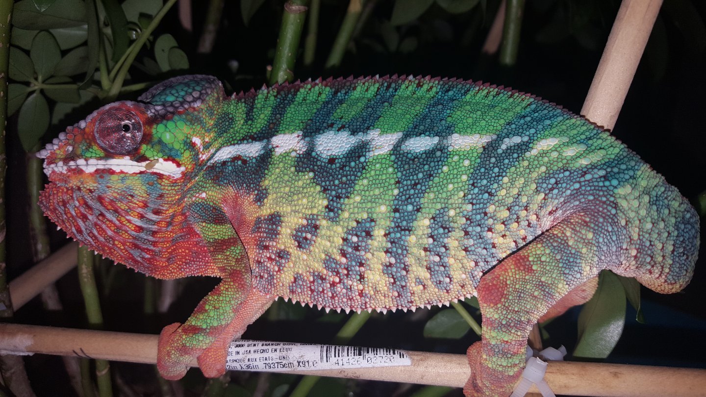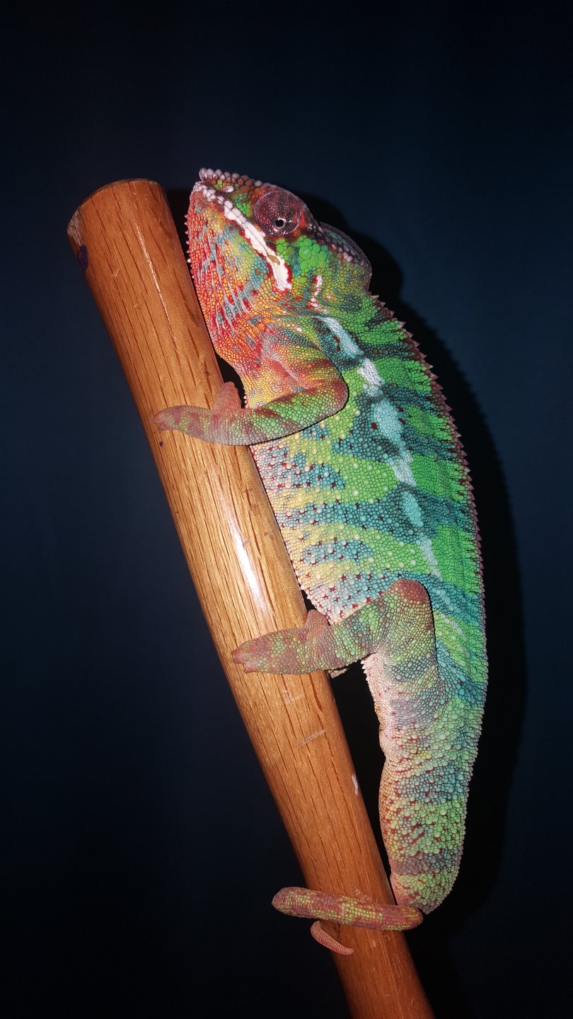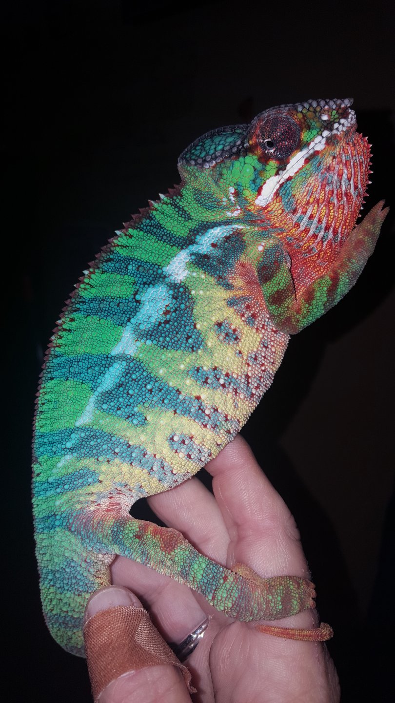 10 month old Ambilobe male. Proven breeder. Eggs in incubator. Has excellent lineage including Kammerflage Kreations, Panther Baron and Canvas Chameleons. The pics don't do him justice. His colors are vibrant. He is a beauty and won't last long. Get him while available. $400 plus shipping.