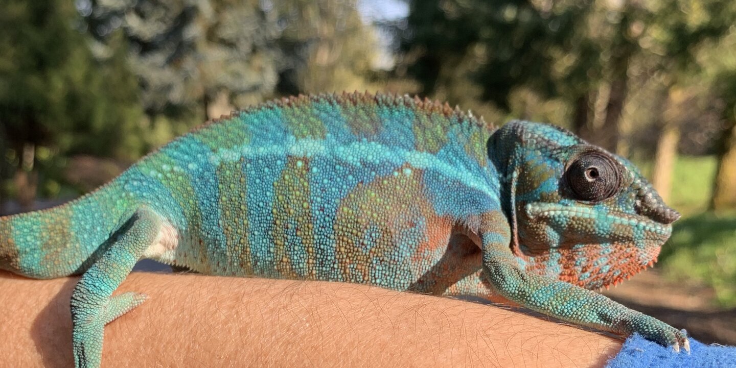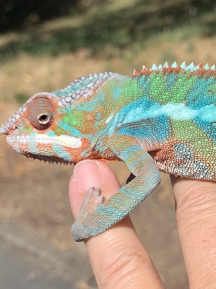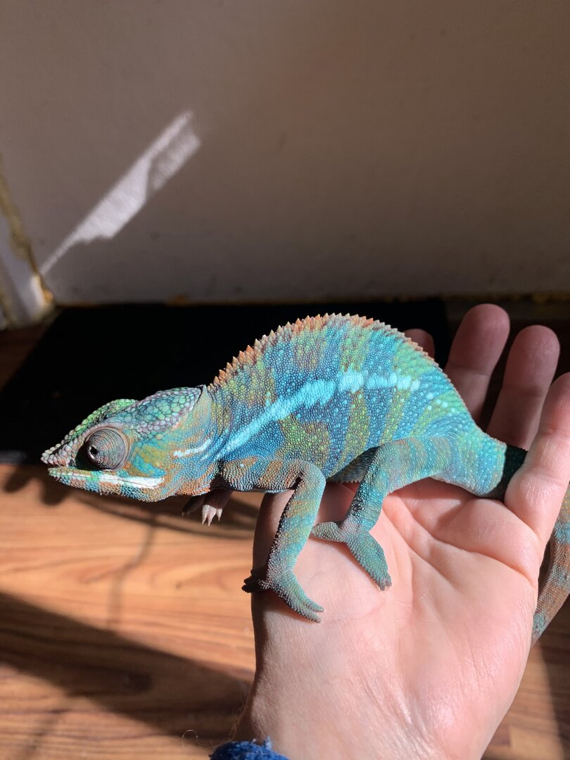 The sire is Floki a beautiful Orange bodied blue bar. (last picture). All our chameleons are raised by a veterinarian so rest assured that you are receiving a healthy, quality pet. We have a 100% heath guarantee.