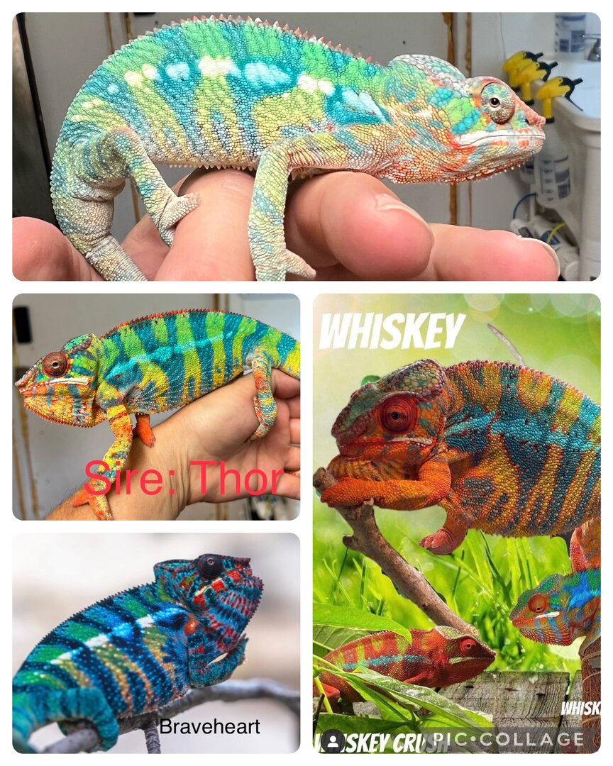Sire Thor come from the Grandsire of kamerflage Kreation's Braveheart known for his Blue kreep in colors which we are already seeing in these babies. The Dam is from the Whisky and Whisky Sour line which is from some of my older chameleons' Ragnar. Their colors are amazing.