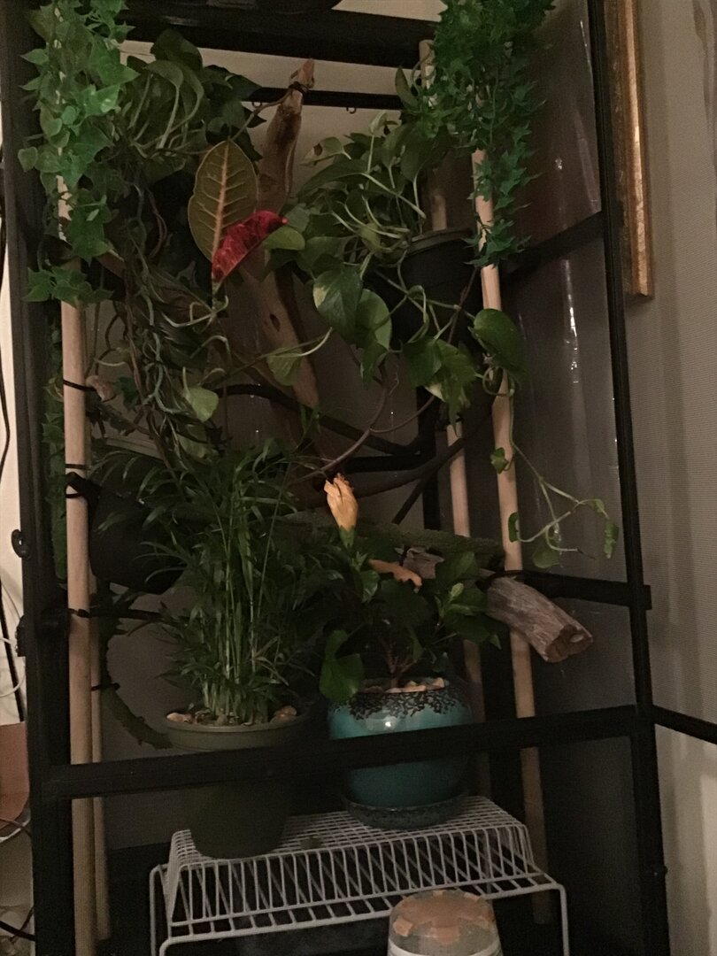 Great job on updating of your girl’s home. :) Sounds like you’ve taken care of the priority essentials. You’ll be wanting to add more vines/sticks...create more little ‘roads’ for her to travel. They like to have places to hide so adding more greenery will help. I love Pothos as do my girls. Nice sized leaves to catch water for them to drink from, hide behind and as they grow they provide more travel lanes. Veileds are plant nibblers and Pothos is safe for them to eat. One of the site sponsors, Dragon Strand, has a product called dragon ledges which enable you to add plants and such higher up the enclosure sides. 084A0763-5D88-4B85-A7BA-5383DFB30ACC.jpeg