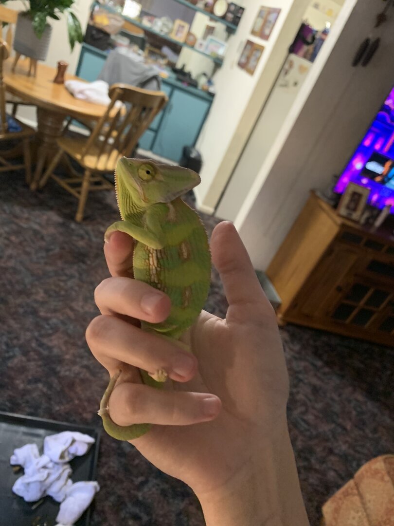 Here’s melvin my newest edition. He’s absolutely wonderful, the most docile out of all my chameleons (he does have his hissy fits sometimes lol!) I plan on breeding him when I find the appropriate female and feel 100% certain about it. I’ve been using lots of my free time looking into it. He’s also a good eater and healthy as can be.