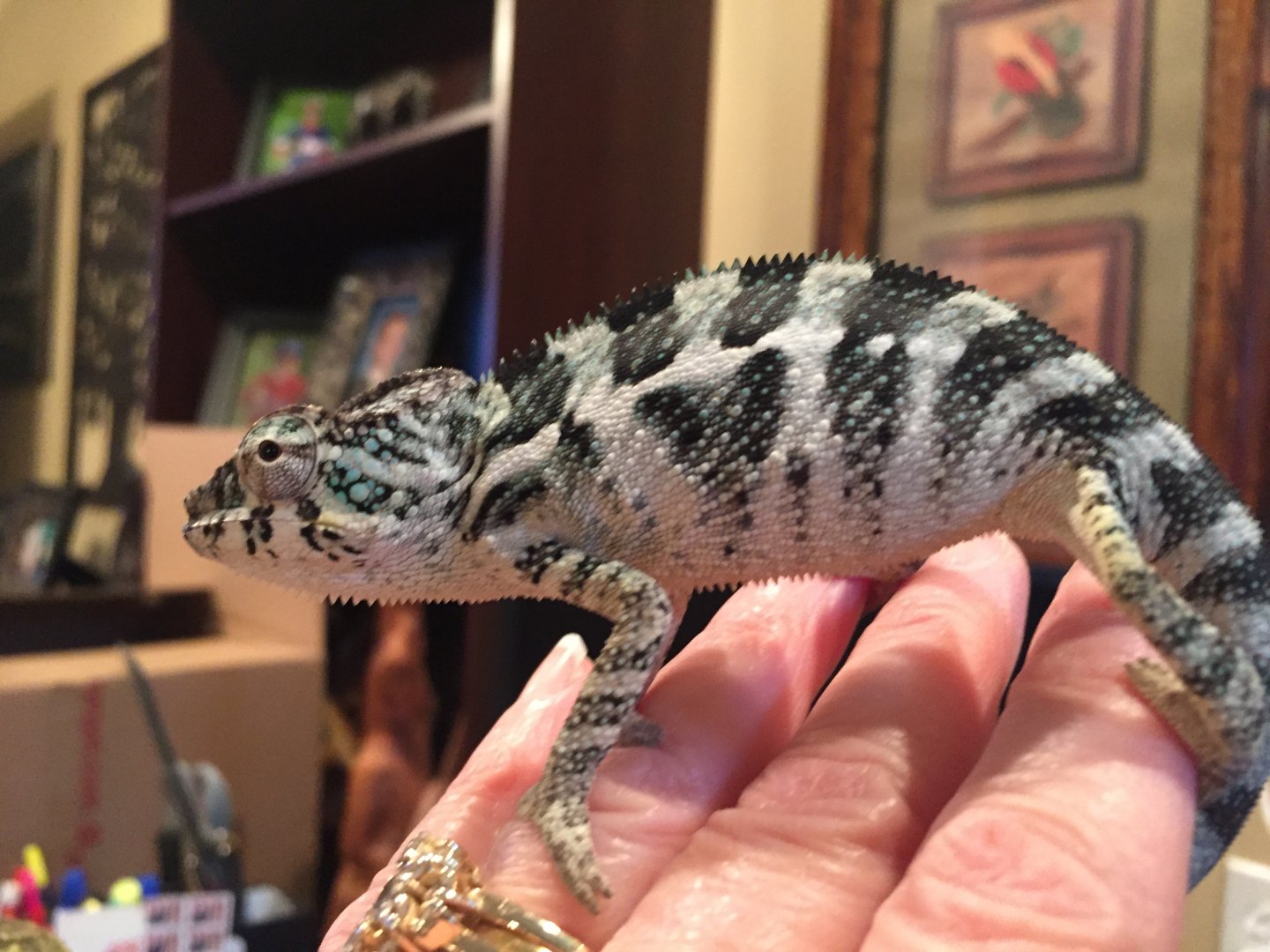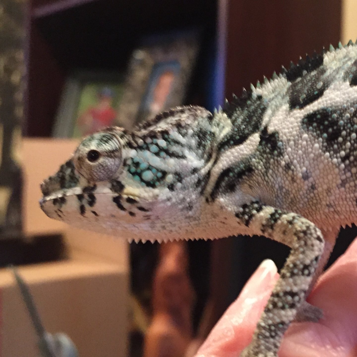 Amazing how tame he is!! I'm envious, my females are like your males, I like the coloring of your cham, what locale is he? When he turns 6 - 8 months I would cut back on feeding, every other day, a fat cham is unhealthy. Fyi, they need heat and uv rays to digest and absorb their food.