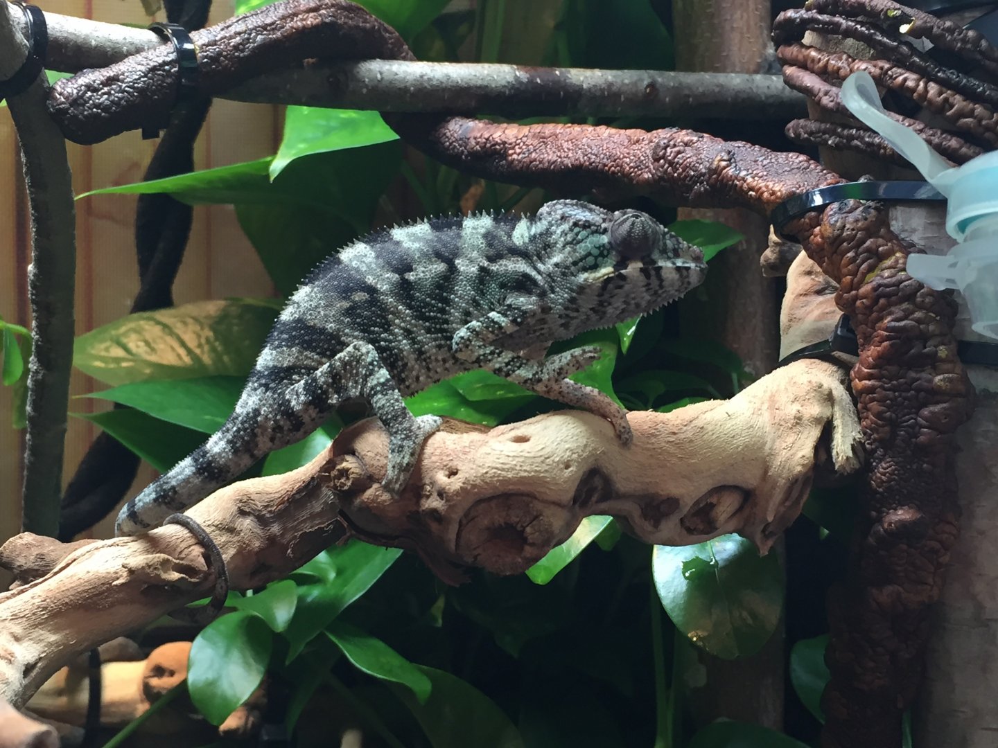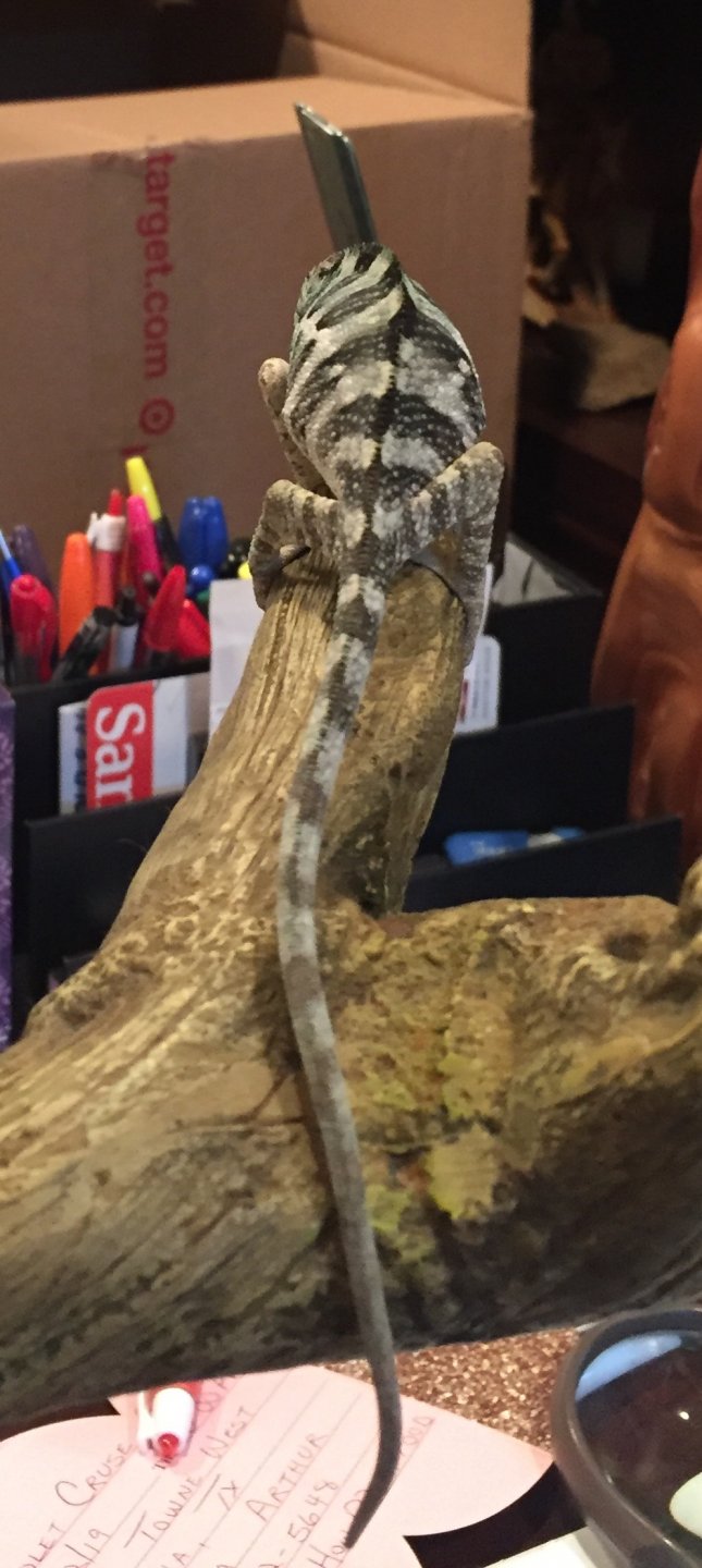 So Angus is so darn cute - I have had him for almost one week now and he has come out with me all but one day each day and let me handle him. He eats like a champ from the get go - I think he is getting fat though -(see pic below ) . So I feed him about 11-15 small crickets - I have added in 4 small roaches and before I can get all the crickets in the feeder cup, he’s there snatching them up - I have to add them in between his chewing each one. He loves the feeder cup as long as it is below him. He was below it one day and tried to zap one or two from the outside since it was clear and it stunned him but I think he has figured it out. I have a special mini shallow bowl feeder that sits inside a green holder in the cage, however , I have spoiled him. Each afternoon when I get home from work, I come in and feed him 3 superworms as a treat. The catch is is that he wants me to hold that bowl up for him and he like to eat them “as long as “ I am holding it. When I tried to put it in the holder, he like sat down , as soon as I picked it up and put back in front of him , he gets up and gets them quickly. He’s spoiled and now goes to that area when i get home as I think he is waiting for those . He loves them ! He has also figured out that he does not like the mister nozzles and gets out of the way before they come on. And of all things he likes to sleep on the green bowl container because it is the width of his body and he can wrap all four toes around and lay his chin flat on it. It’s right in front of the cage door . Last 2 nights that is where he wants to be. It holds water drops well and he keeps drinking water from that and the vines. Although, he is fascinated by the little dripper tube that keeps dropping water On The leaves. I have found him completely in a trance watching the water come out of it in amazement by his intensity . I find it funny the way he watches it. Anyway, having fun with my baby and I miss him when I am at work so I got a pet cam that I can use my iPhone to watch him during the day when I’m at work. I did that today and it gave me peace of mind. I can also span over and see my Quaker parrot too so I’m enjoying that .