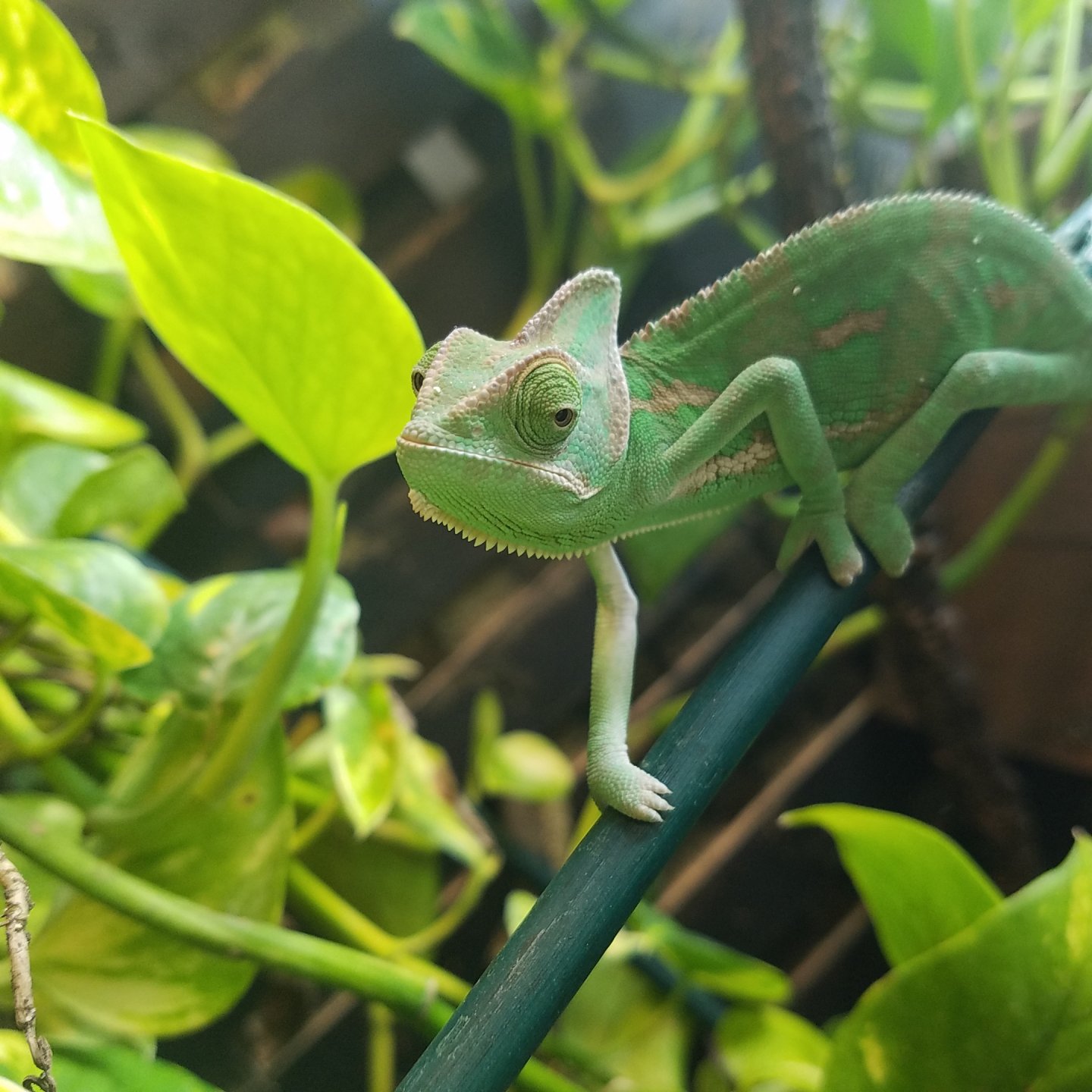 So technically rampant may not be the best term. So while finishing my enclosure I had my pothos and ficus outdoors for awhile. Apparently some Anoles thought one of the plants looked like a decent place to lay eggs. So now I have two (hopefully) baby anoles hiding among the various plants and branches of my Veileds enclosure. The are too small to do much harm or take down any of the food items. But I can't catch the little devils. Any tips on how to remove them without a complete breakdown? My biggest concern is possible parasite cross contamination.