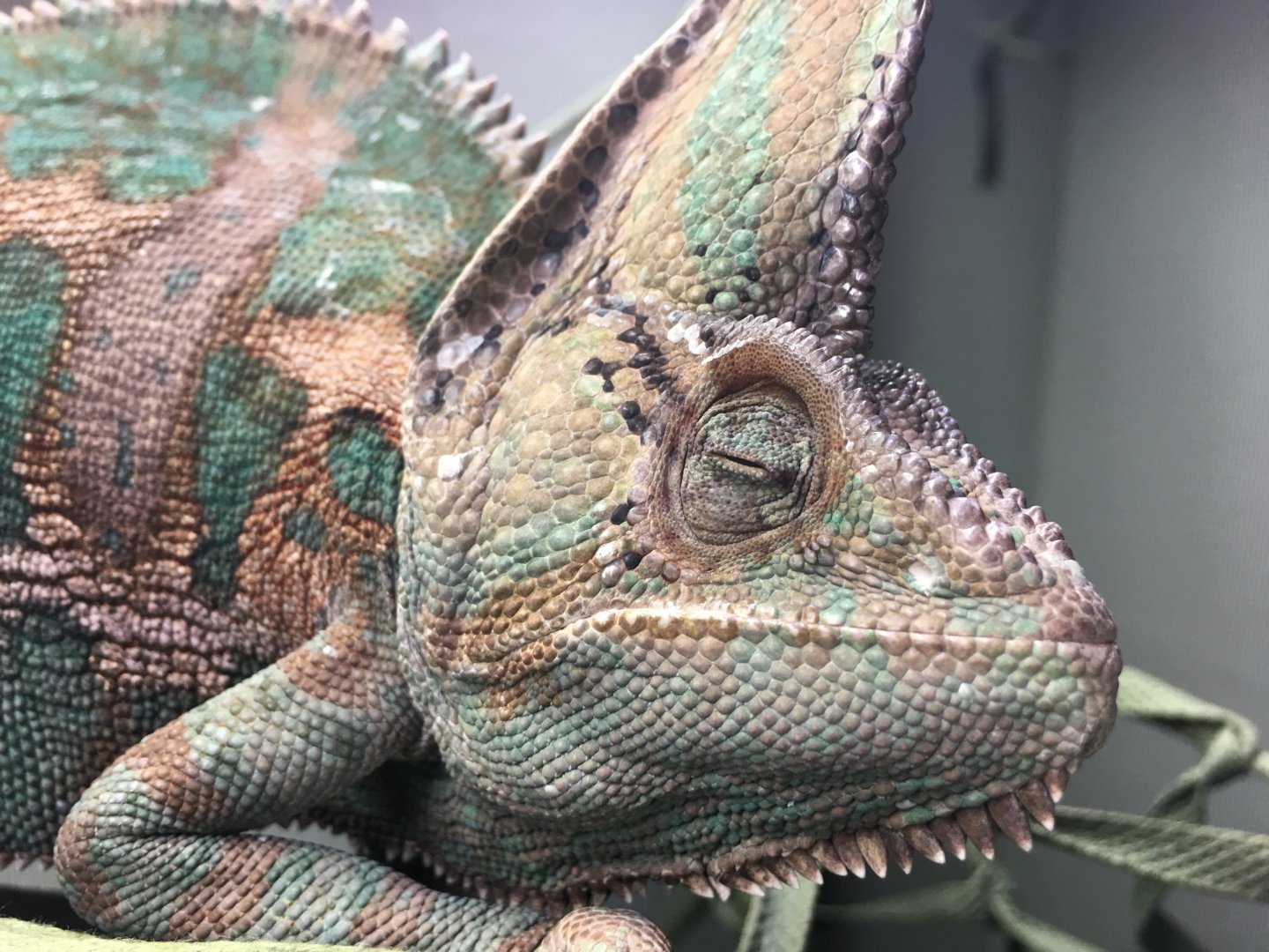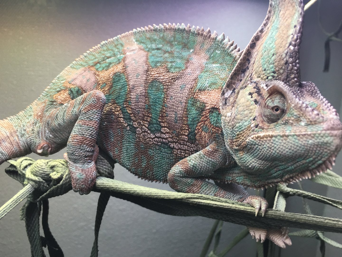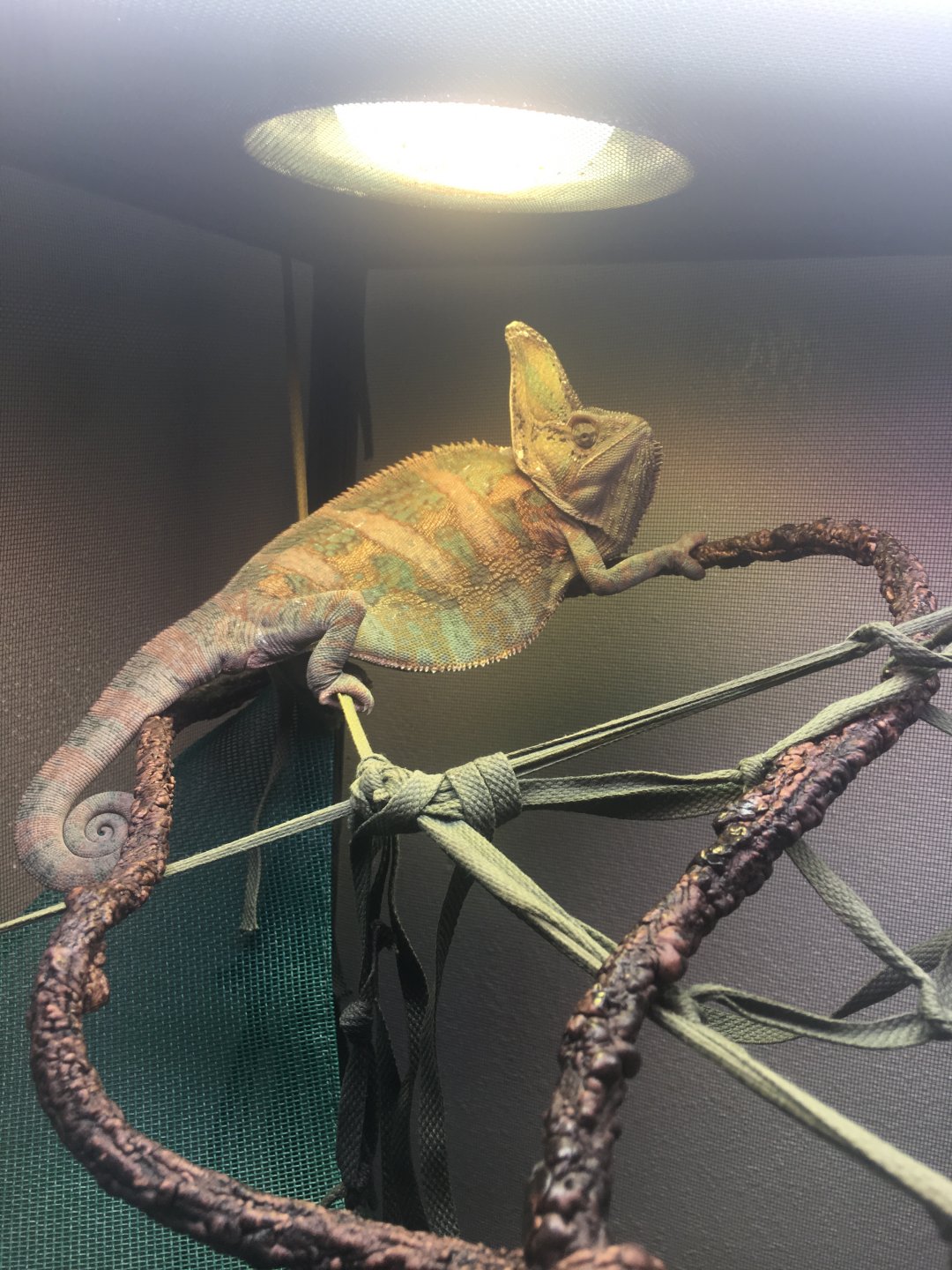 *** More about lights *** As I was looking at pictures to upload in this thread I noticed not all of his lights were on in the quad. Two of the bulbs (the two that get hit by some water when I spray him) were out. One of them was the 6% UVB. Now that I'm thinking UVB issues some other symptoms come to mind, like he doesn't seem to stand as tall as he used to. You can see that in one pic. He does have a sturdy grip and he does like to bask under the Solar Glo, so he's not totally devoid of UVB.