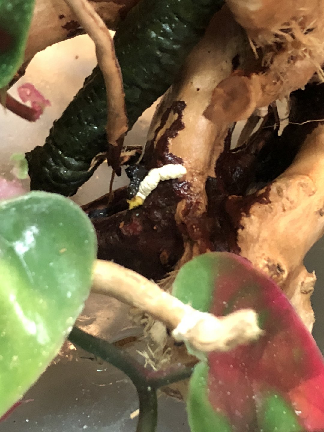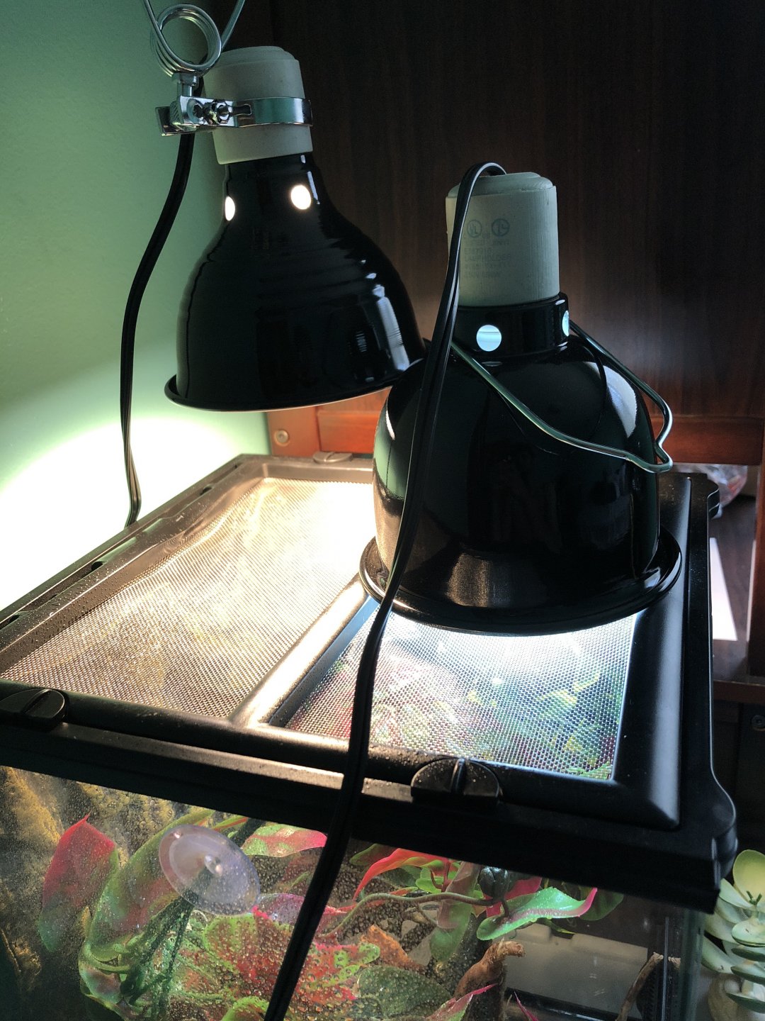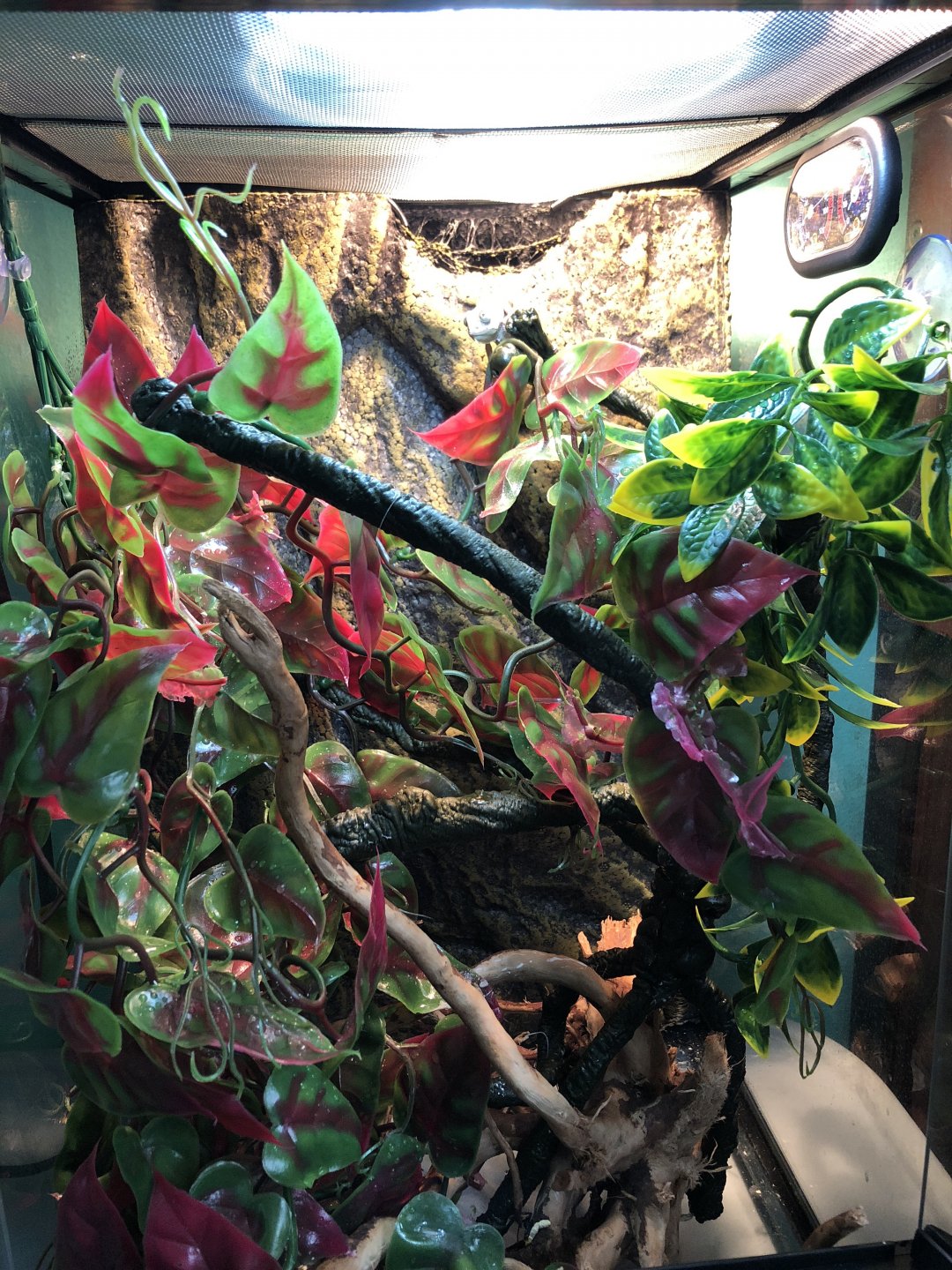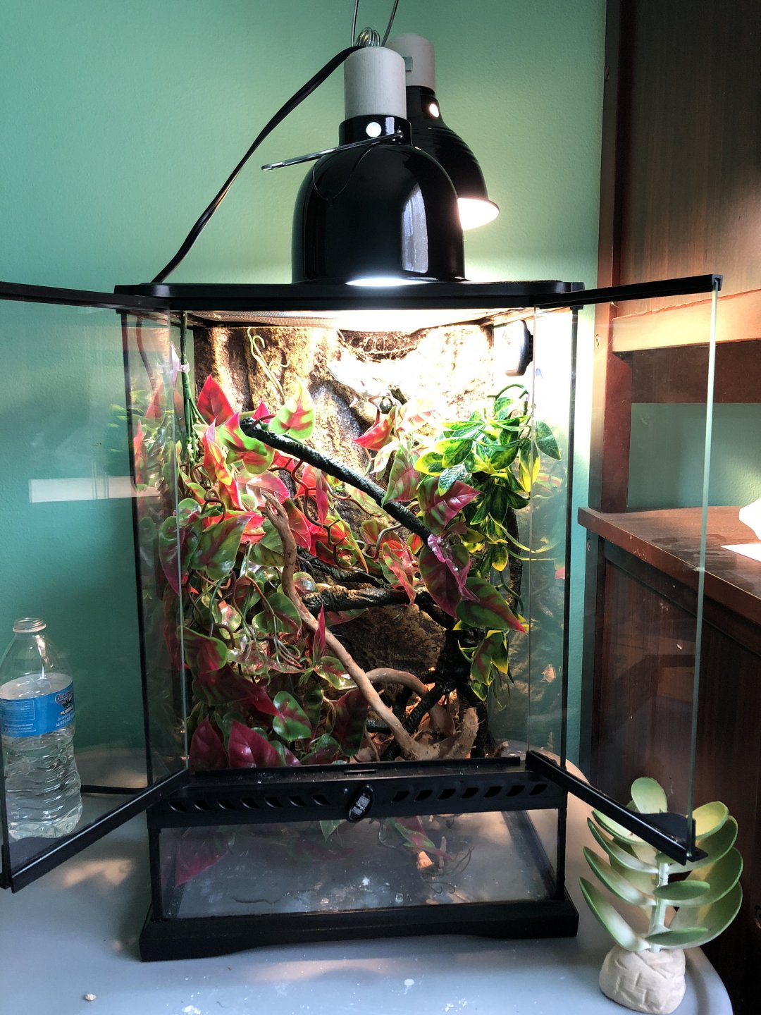 First of all, these people told me to put the light directly on the cage, I came home to see part of the back of the cage began to melt. So now I’m freaking out. They also said this small glass 24x12x12 cage was perfect for him all the way until he matured. Total lie after all the research I’ve done. So I was going to go out to the store immediately and buy a 48x24x24 cage but my problem is he’s only about 4 weeks old. So the picture you’re seeing of Mojo is when I came home before it was lights out time and he looked so beautiful and healthy. But he just gets so dark and grey so often and I read that that means they’re stressed and unhappy. So I’m stressing. I’ve been misting his cage several times a day to keep the humidity between 50-60 percent. I have fake plants in his cage, nothing real. He also eats a ton. I’ve been giving him “small” crickets from PetSmart. I use a calcium without d3 every time I feed him and I also have a multivitamin and a calcium with d3 that Ill give him once every 2 weeks. I got all the UV 5.0 and the basking light set up but I believe the basking light was melting part of his cage. Nevertheless he was so grey and dull yesterday and I decided to move his cage around and wipe it down a bit (I had them set it up there for me. They appeared to know a decent amount about the animal?) but they didn’t have a nice high spot set up for him to bask under so that’s why I changed it around. However when I did finally get him out (he did not want out) he turned back to that beautiful light green color which made me happy personally lol. I’m gonna attach pictures of this enclosure. Please don’t hate me to hard, I’m doing anything and everything in my power to make sure this little guy has the right home. I’ve also been gut loading the crickets with this high calcium cricket food and carrots. Sorry it’s so much to read I’m just stressed and scared for my little buddy Mojo