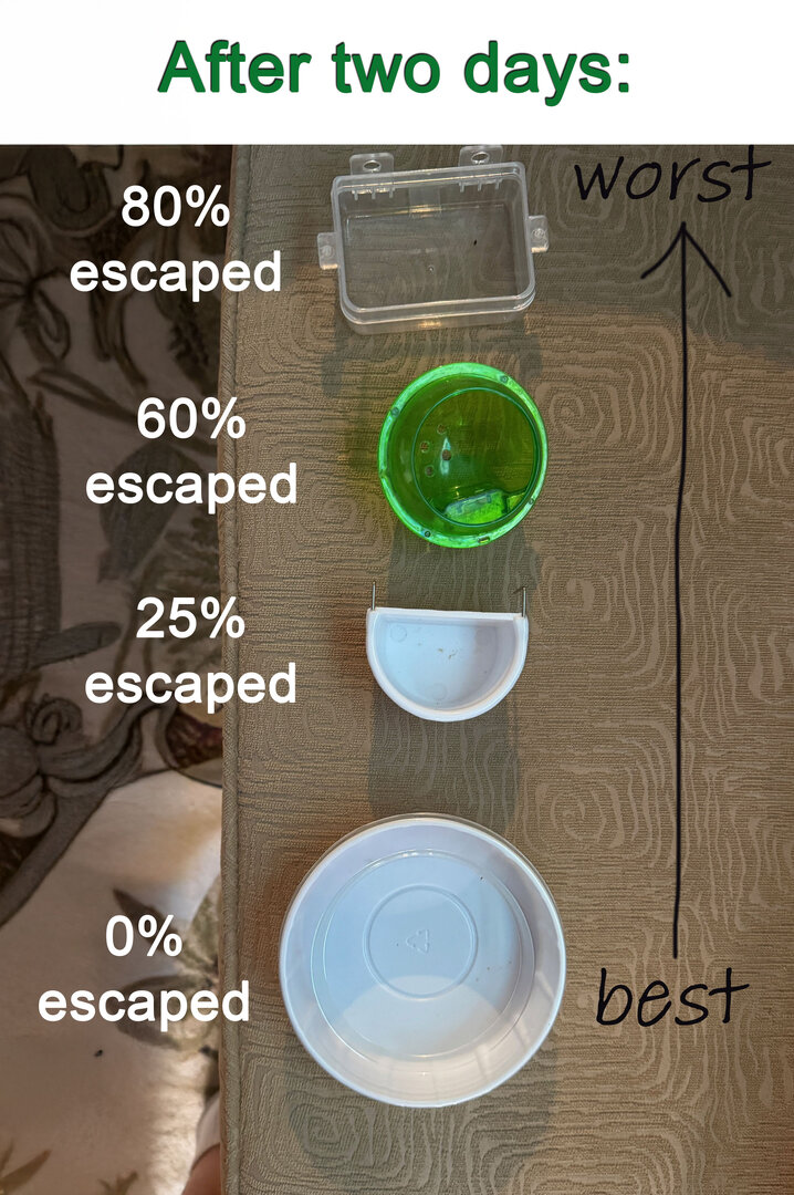 I did my testing using Large 7/8" dubias. In retrospect, smaller dubias probably wouldn't escape as easily. I tested 4 different popular containers and only one was foolproof (the one that cost $.50 cents, LOL). Results below: