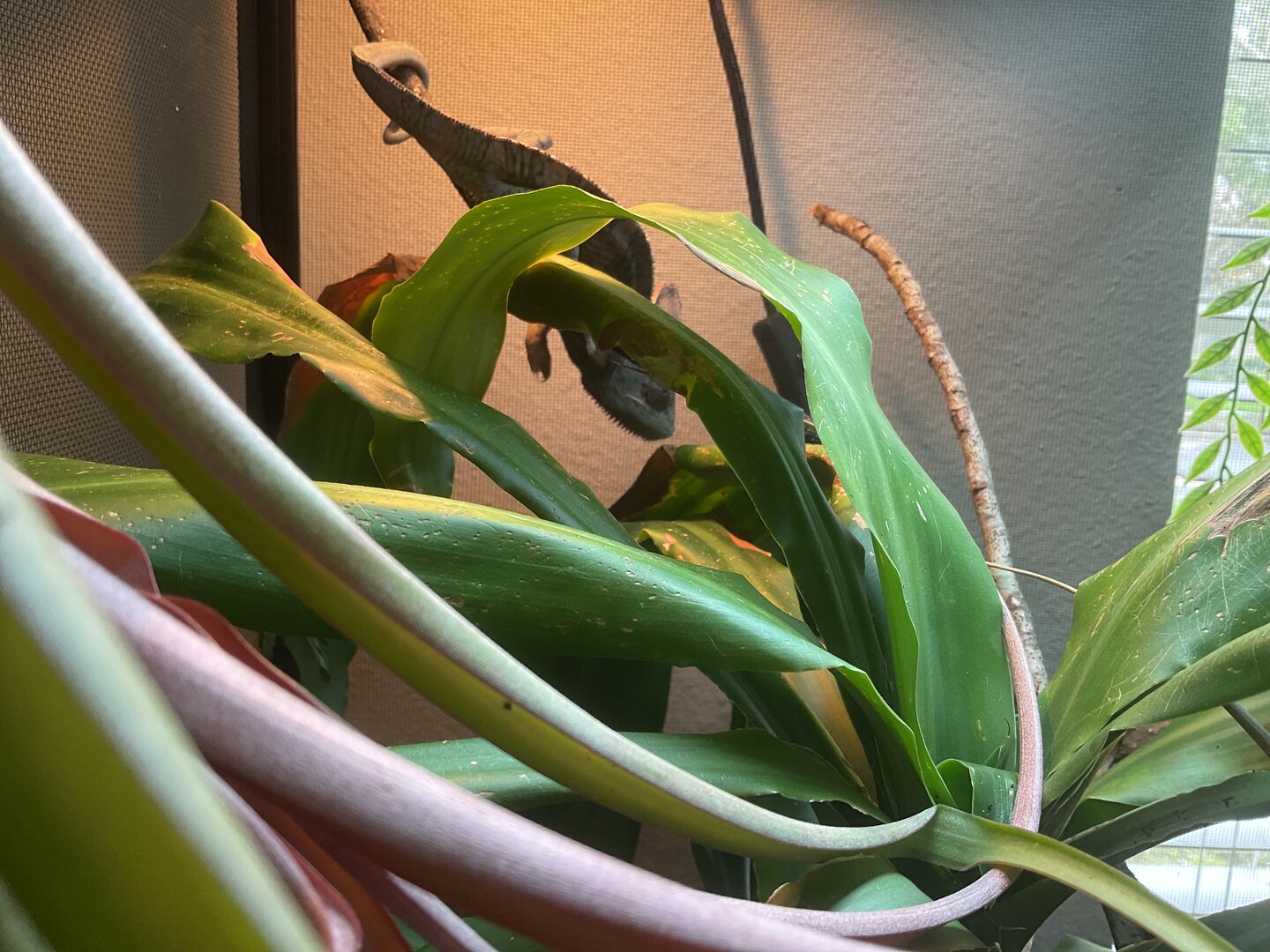 So yesterday, Spyro ( my 10-12 month old male veiled chameleon ) finally took 4 hornworms from my hand. He was hiding behind a plant, and he couldn’t see my face. Today when I tried again, he could see my face. I tried for about 10 minutes but he didn’t take it and kept just staring at me. Any tips to help him trust me more? Or so he can just take it without any type of fear?