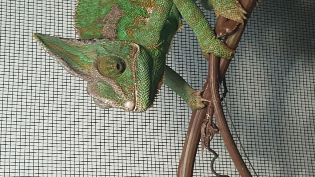 The species, sex, and age of your chameleon. How long has it been in your care? It's a male veiled cham, about a year old. I've had him for about 3 weeks nonow