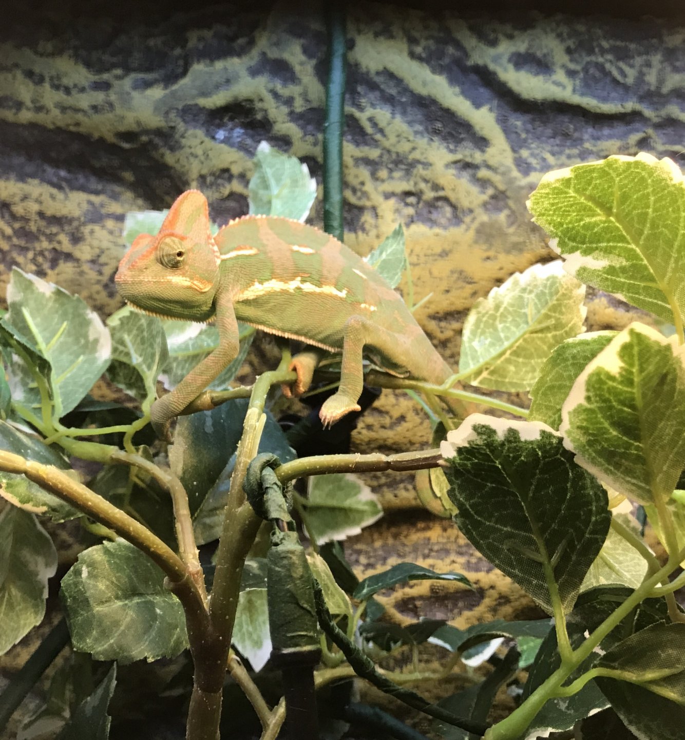 Hi everyone, this is my new juvenile chameleon. I don't know exactly how old he is, I purchased him as a "juvenile of 3-4 inches" last month. He's already had one shed and definitely showing some more color and pattern that he had when he first arrived. He has bright orange on his head and spine, and his stripes almost have an orange or tan tint to them as well.