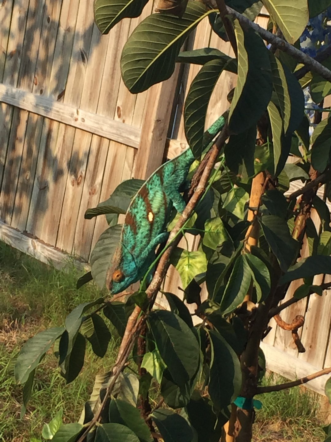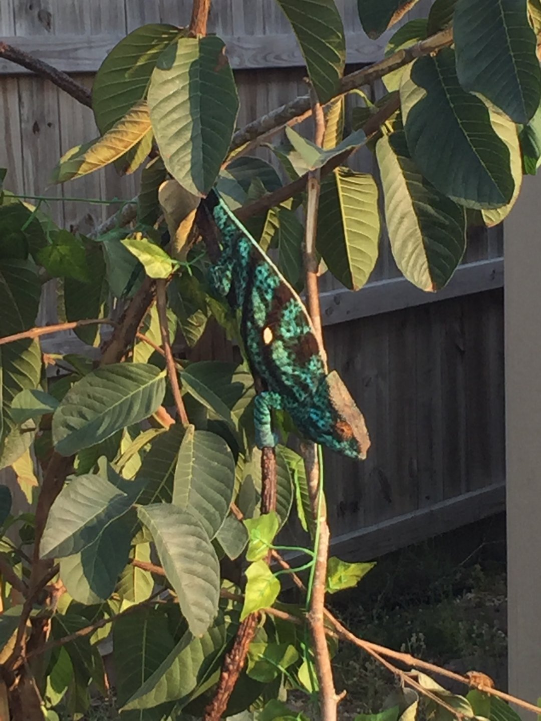 I finally took him outside! I do not handle him unless I need to weight him or move him for good reasons.(like the mess going on right now) but I did take him outside on his favorite tree that he was probably sitting there like man what did you do to my tree! He didn't understand what was going on at first but once he realized the sun was coming up faster and faster(it was around 8:45ish) he stretched out and took it all in while he was looking at me real hard. He was out here for almost an hour and I'm surprised he was looking at me so much and not his surroundings. I was about 15 feet from him on the porch. But now that it's warmer and time for the chams to get some outside time I can really only take mine out in the mornings as it gets too hot here quick:( anyways I tried to leave him alone so only a few pics.