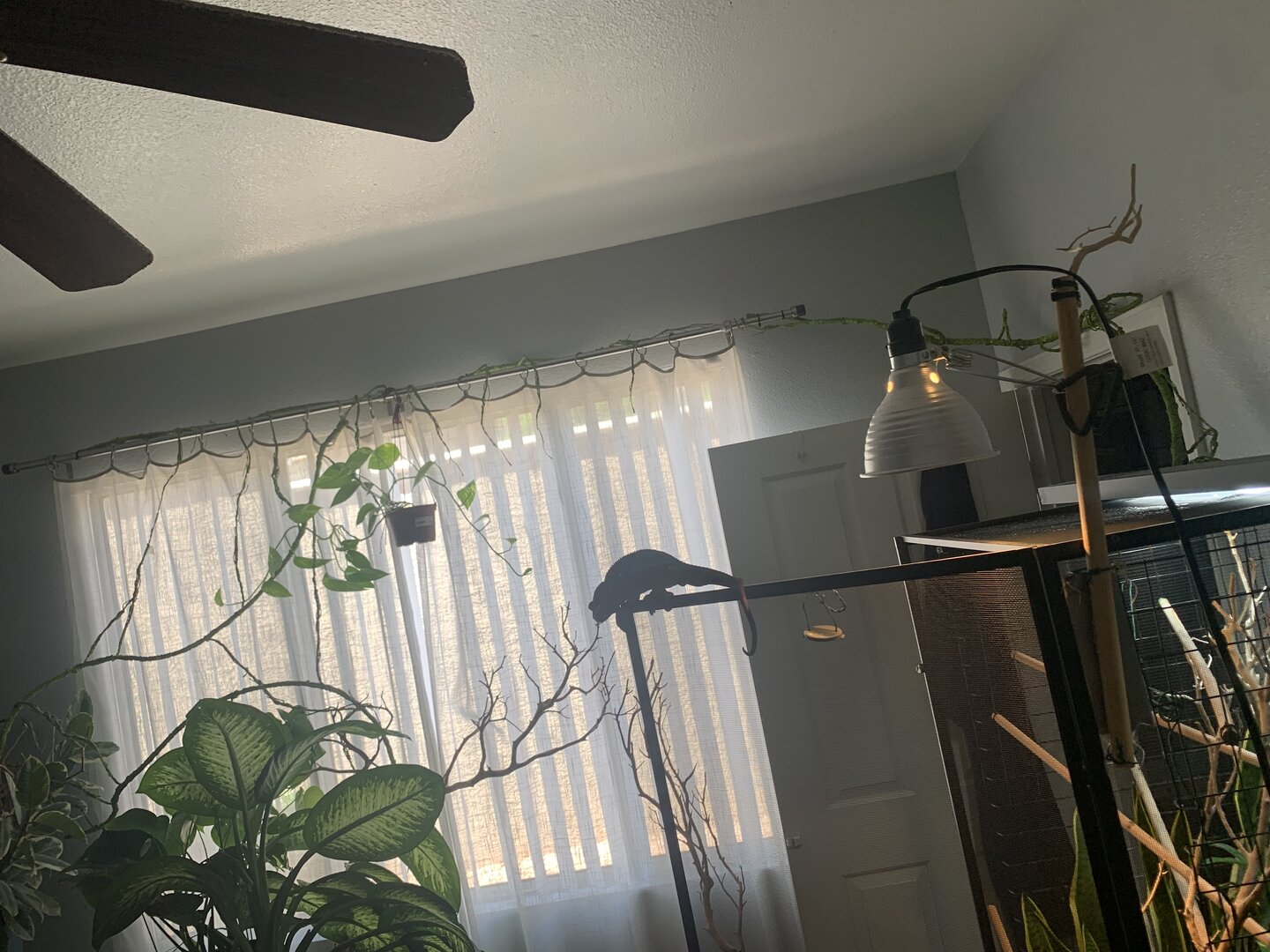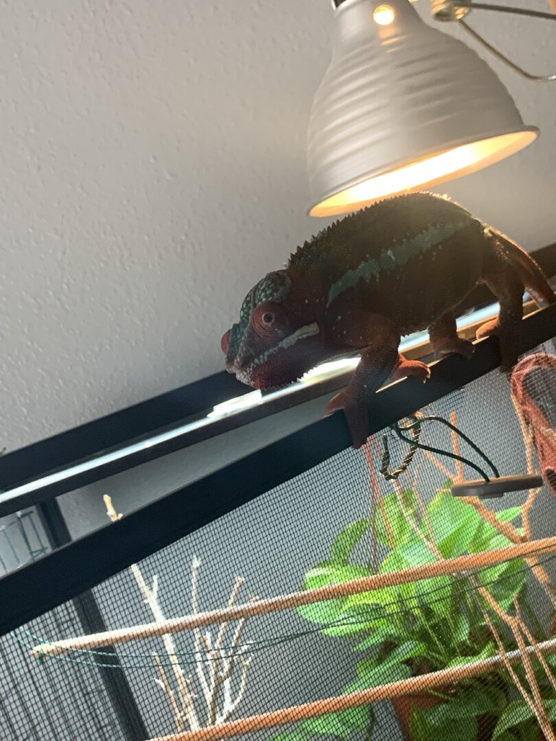 His heat lamp points down at the door hinge where he likes to bask directly under it for short periods of time in the morning. This way the heat lamp isn’t shining directly on wet plants which could cause wilting.