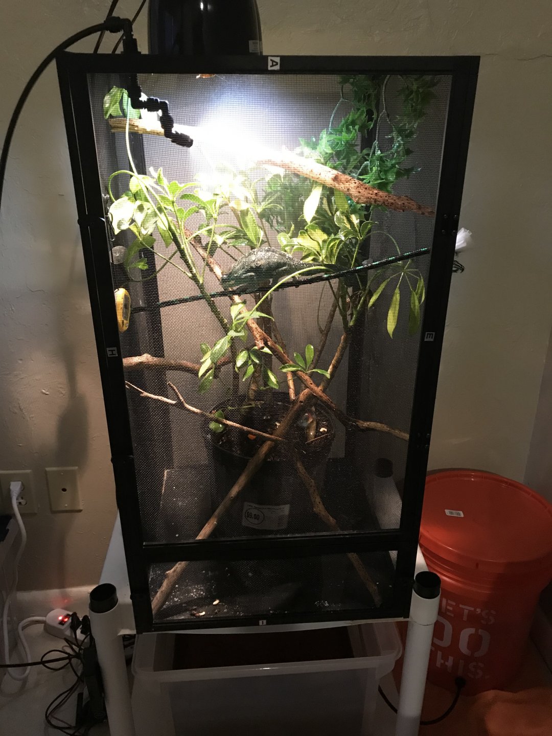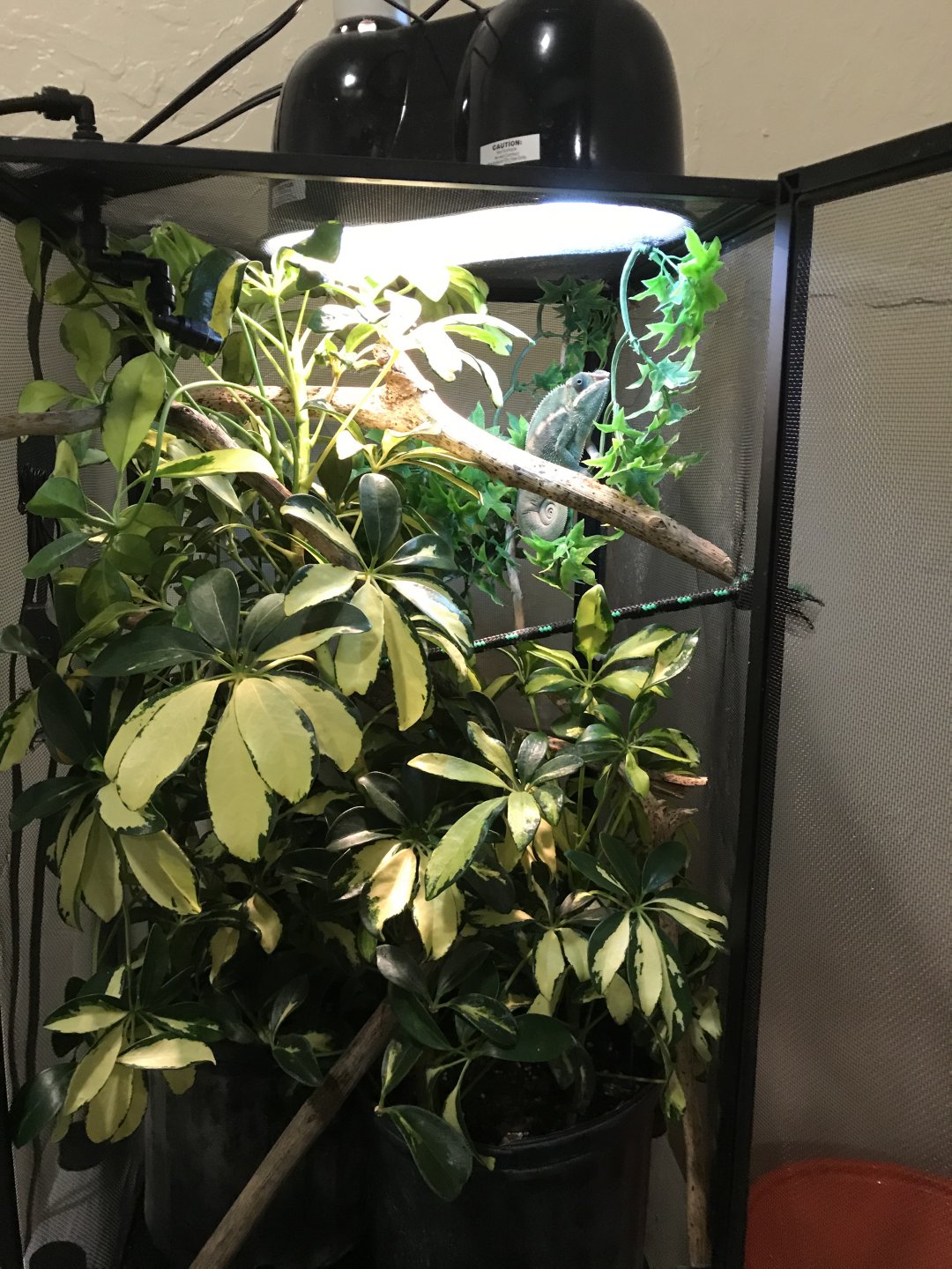 Nice to see your chameleon is warming up to you! I'd just like to say that you should add a little bit more cover for your chameleon.