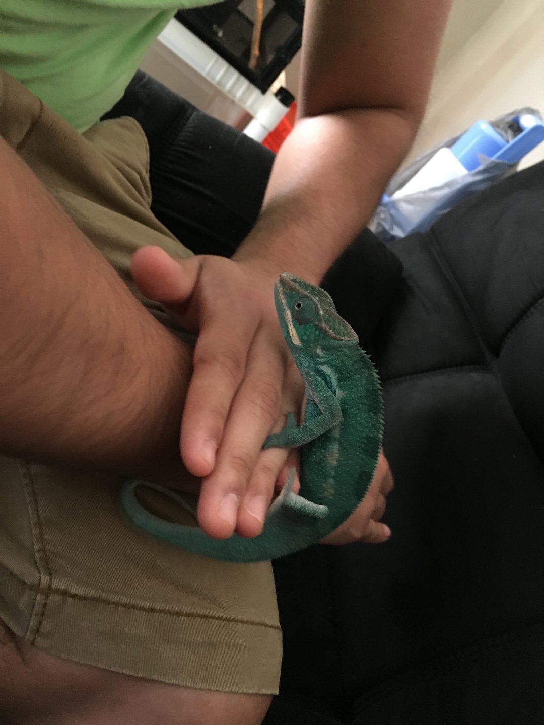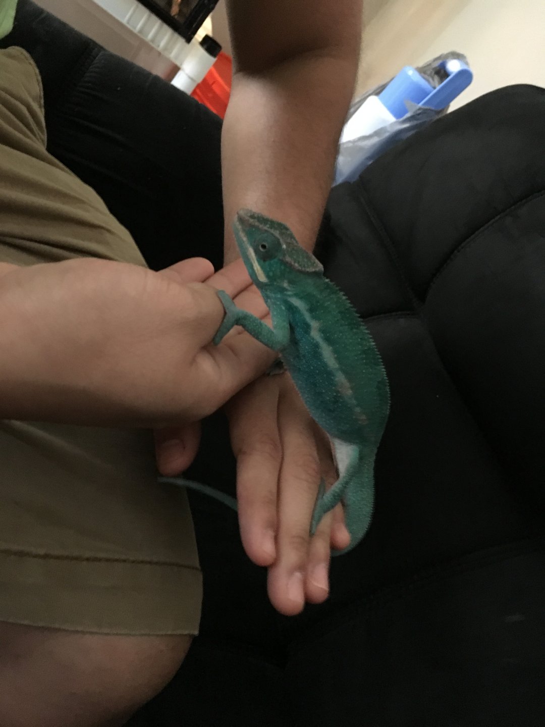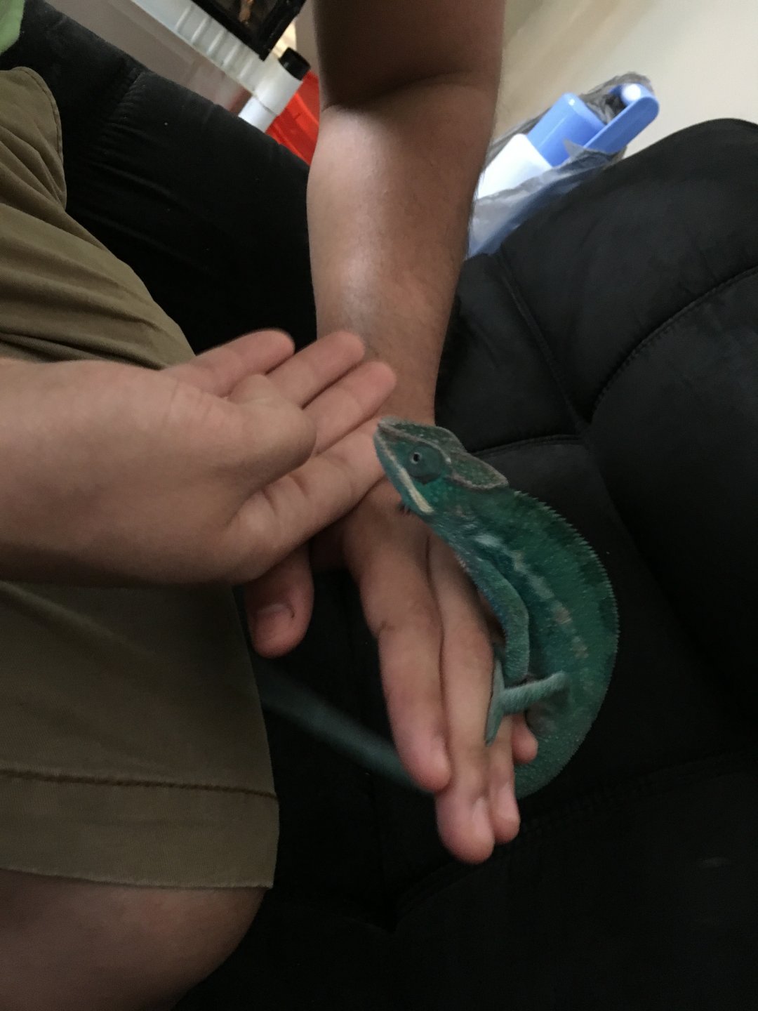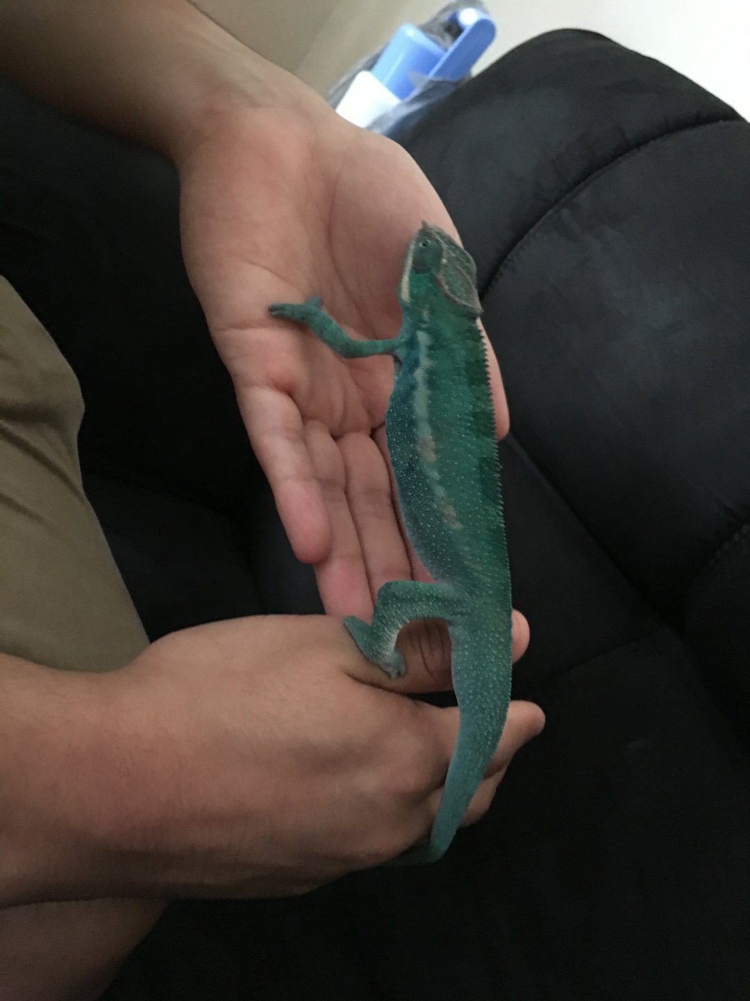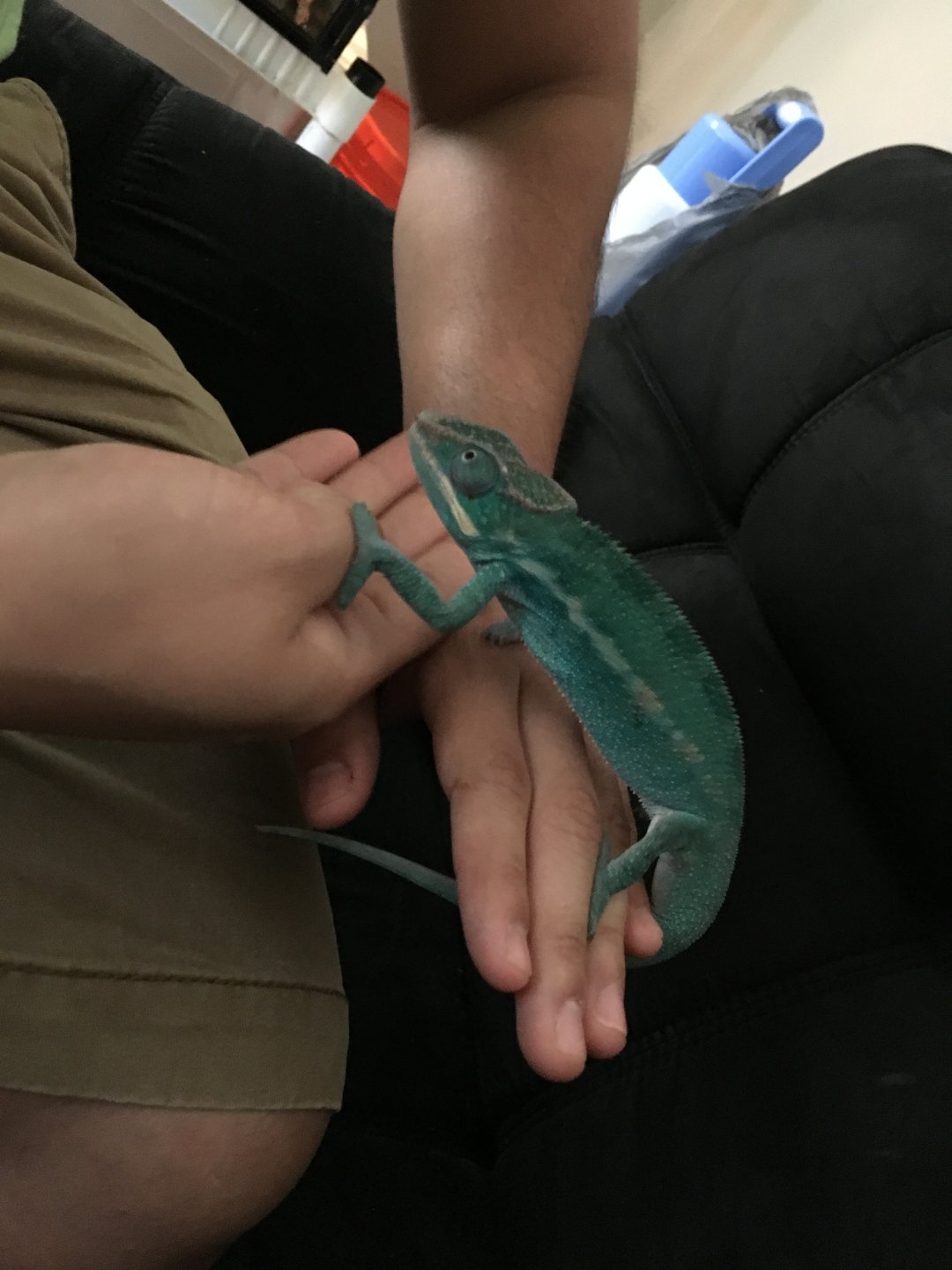 So I’ve been working with my Nosy Be panther chameleon for a while I give him his space and he got a mistking and I always cup feed him and he would run over and just sit there and eat happily. I never forced him to come out or caused any un wanted stress. So today as I was cup feeding him and he just up and eats almost all the crickets then on his own decided to venture out into my arm and just came out and chilled outside his cage crawling around me for a while completely not scared at all!! I have pics!