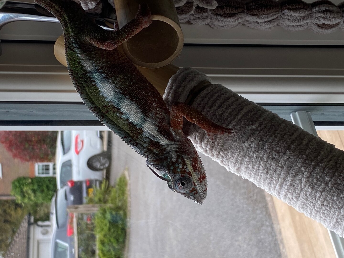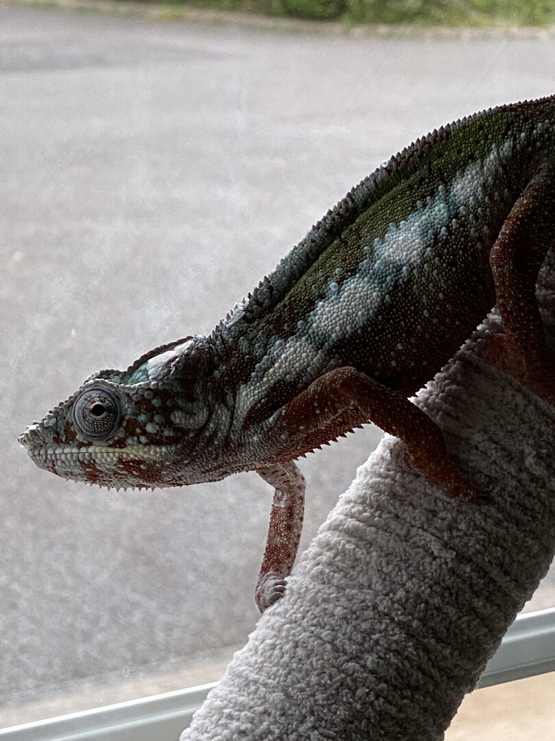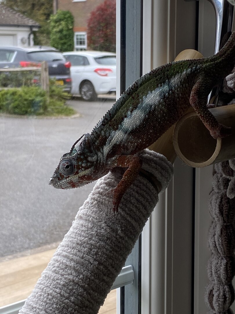 Soooo.... about three months ago, I encountered a friend, who had a chameleon... I wasn’t altogether comfortable with the way it was kept ( long story) .... but he was beautiful... sad but beautiful. Annnnd.... I’ve always had lovely beasts in my life, so for my birthday I went and invested in Viv for first time.. ( and heating, thermometers, uv, misting systems,.... and bug houses, and bug .... oh and endless ... seemingly endless things! ?) ... and ‘specialist’ reptile store sold me panther chameleons... 2 of them... Male and female.... and yes, realised within a week.... I was complete muppet..... so bought second Viv, heating, thermometers etc etc. So now have TWO CHAMS... allegedly 6 months old..... must have been two months old .